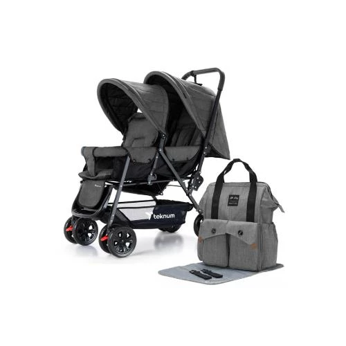 teknum double stroller, twin stroller, double baby stroller, stroller with diaper bag, stroller with changing mat, dark grey stroller, linen stroller, cushioned baby stroller, one hand folding stroller, samBox stroller combo
