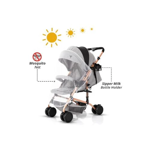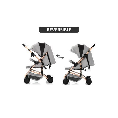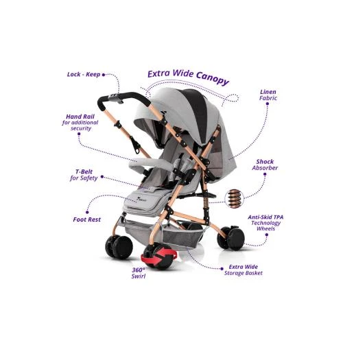 The Teknum Reversible Trip Stroller in stylish grey offers a versatile and comfortable solution for babies aged 6 to 36 months with a load capacity of 15 kg. Featuring a reversible handle, your little one can face you or look forward, enhancing bonding and curiosity during strolls. Equipped with 5-inch front and rear EVA wheels and steel shock absorbers, this stroller ensures a smooth, shockproof ride on all terrains. The stroller is crafted with a sturdy steel frame, linen canopy, and bassinet, complemented by an oxford fabric shopping basket for added convenience. Safety is guaranteed with a 5-point harness, hand rail, hand and wheel brakes, and a 360° swivel front wheel with locking system. The extra-wide canopy provides excellent sun protection, while included accessories like a coffee cup holder, mosquito net, and cotton pad enhance comfort. It folds easily with one button for compact storage and portability.