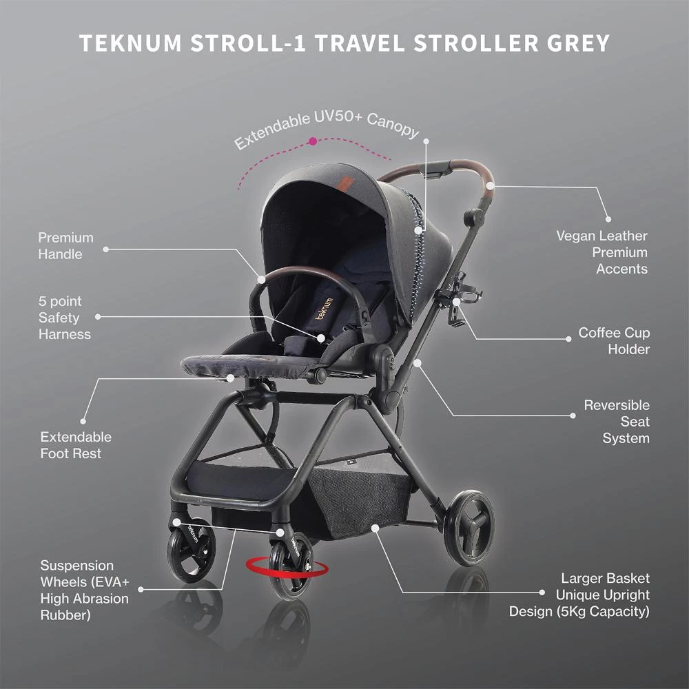 The Teknum STROLL-1 Travel System with Reversible Stroller and Baby Car Seat - Grey by SAMBOX is thoughtfully designed for parents who need flexibility and peace of mind when traveling with their baby. This innovative system pairs the popular STROLL-1 Reversible Stroller, which allows the seat to face parents or the world, with the Compacto Baby Car Seat for a seamless transition between car rides and strolls. The strollers compact single-hand fold, breathable seat fabric, smooth suspension wheels, UV50+ canopy, and designer vegan leather details deliver unmatched style and functionality. Suitable from birth to 4 years (up to 22 kg), your child can rest comfortably with full recline and secure 5-point harness. The included car seat is lightweight yet sturdy, easy to install with any cars seat belt, and provides cushioned support, an adjustable handle, and a protective foot cover. The perfect gift for newborns, this all-in-one travel system helps you enjoy every adventure with ease.
