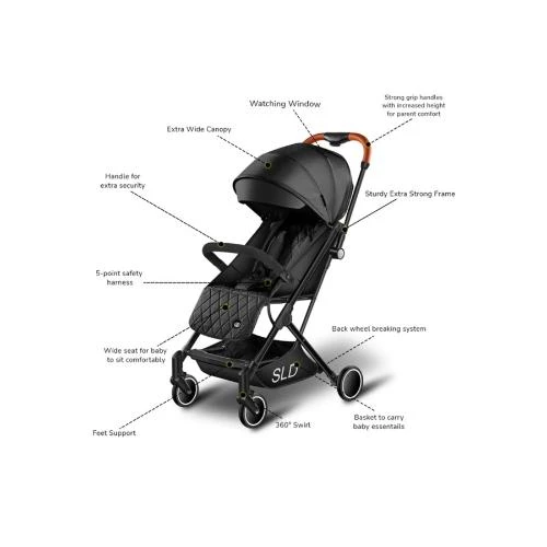 Experience unmatched convenience with the Travel Lite Stroller - SLD by Teknum, weighing only 4.9kg, making it the lightest stroller designed for effortless one-second single-hand folding and unfolding. Its compact folded size of 604130cm fits most aircraft cabin luggage, ideal for travel. Crafted with a double triangle aviation-grade aluminum alloy frame, it offers superior strength and stability while maintaining lightweight portability. The stroller features a shock-absorbing wheel system with 360° swivel lockable wheels, allowing smooth navigation across rough roads, grass, slopes, or desert terrain. A wide seat base with multi-position recline (95° to 180°) ensures babys comfort, while an adjustable canopy with a transparent skylight window lets you keep an eye on your little one. Safety is prioritized with a 5-point seat harness and easy one-foot brakes. Included accessories such as a mosquito net, seat cover, and stroller carry bag enhance usability and cleanliness. Complementing the stroller is the stylish Sunveno Styler Fashion Diaper Bag in black, boasting jumbo storage with 11 pockets, 5 compartments, and 5 zippers, designed for optimal organization on-the-go. Whether strolling in the city or traveling far, this stroller and bag combo offers comfort, style, and practicality for both baby and parent.