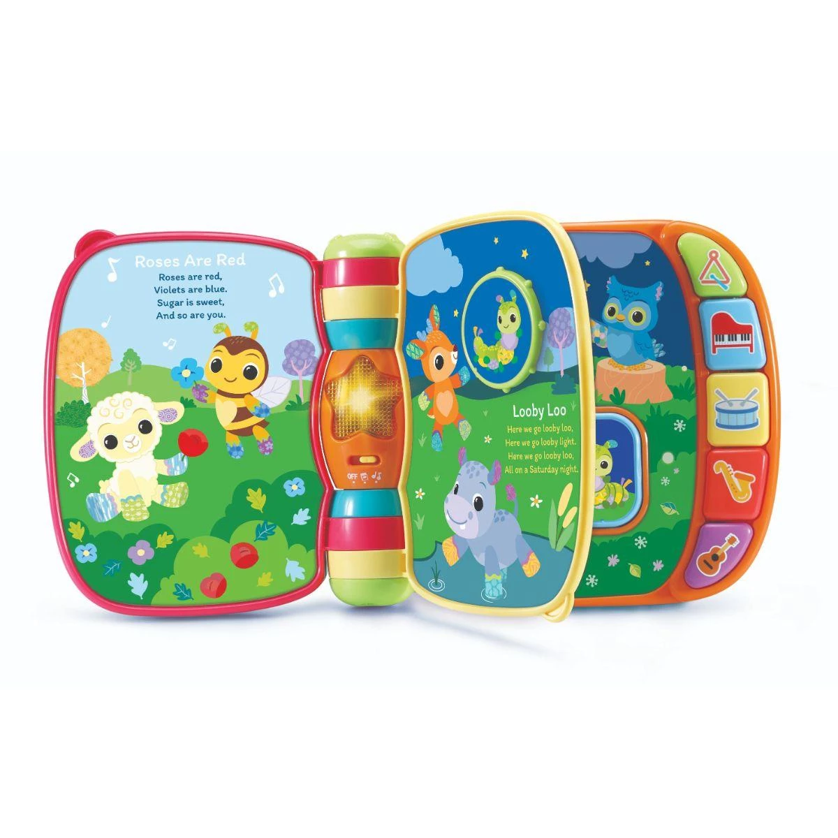 The Vtech Animal Rhymes Music Book is a fun and interactive musical book featuring six familiar nursery rhymes with engaging illustrations and interactive play features. Easy-to-turn pages help develop fine motor skills, while colorful piano key buttons introduce musical instruments, colors, and vocabulary. Switch between Nursery Rhyme Mode for sing-along fun or Music Mode for delightful melodies and sounds. Designed for early learning and sensory play, this book is perfect for babies and toddlers.