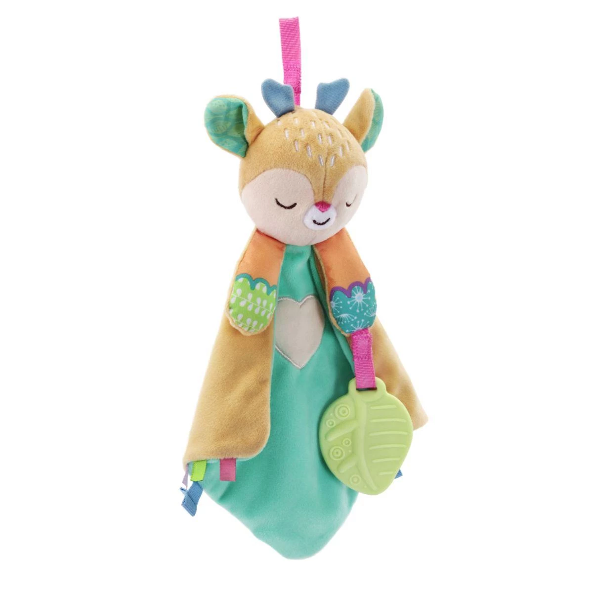 Introducing My Friend Fawn by VTech! This cuddly, adorable friend transforms from a soothing blanket into a dummy and teether holder, with a variety of soft fabrics that provide comforting tactile stimulation. The lightweight design makes it easy for your little one to hold and interact with. Press Fawn's light-up face to trigger 3 gentle sing-along songs, 25 calming melodies, nature sounds, and loving phrases, promoting sensory and auditory development. The removable electronic module allows for easy hand washing.