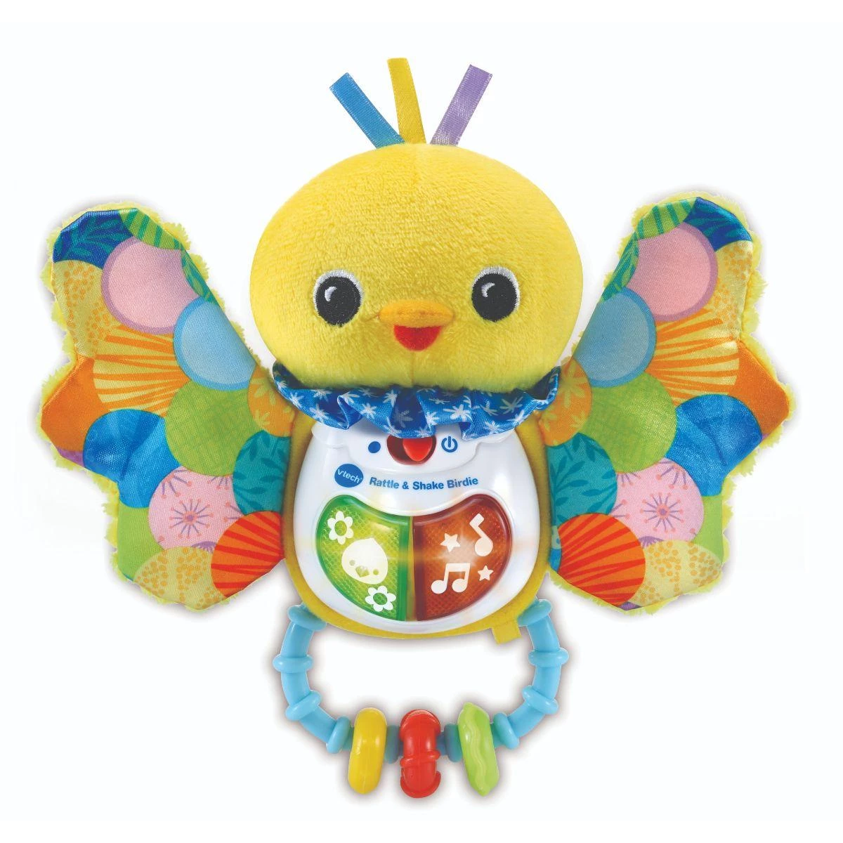The VTech Shake & Play Birdie™ is a friendly and colorful interactive baby toy designed to engage and stimulate your little one. With textured fabrics, bright colors, and an easy-to-grip handle, this adorable birdie encourages tactile exploration and fine motor development. The motion sensor activates fun sound effects, while two light-up buttons introduce cheerful phrases and sing-along songs. Includes 15 melodies and 3 sing-along songs to keep baby entertained. The removable electronic module allows for machine washing, ensuring easy cleaning. A perfect companion for early learning, sensory play, and cause-and-effect discovery!