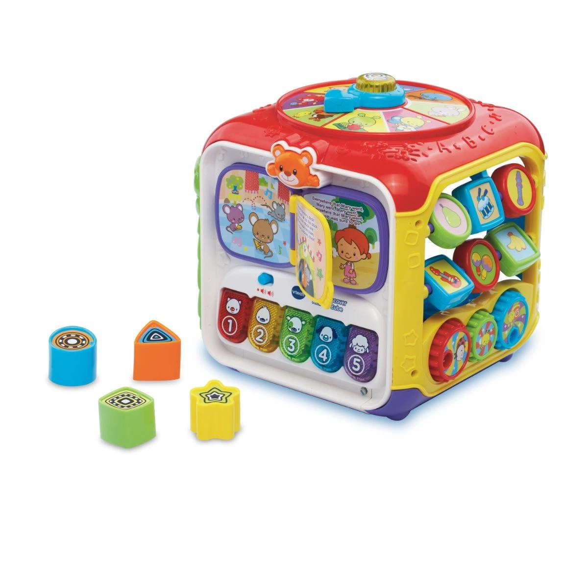 The VTech Sort and Discover Activity Cube is a fun and educational toy designed to engage little learners. With five interactive sides, including two electronic panels, this activity cube introduces animals, objects, music, and colors. Featuring 75+ melodies, sing-along songs, and sound effects, it encourages sensory exploration and fine motor skill development. The light-up spinner, piano keys, and shape sorter add to the interactive play experience, making learning fun for children 9 months and older.