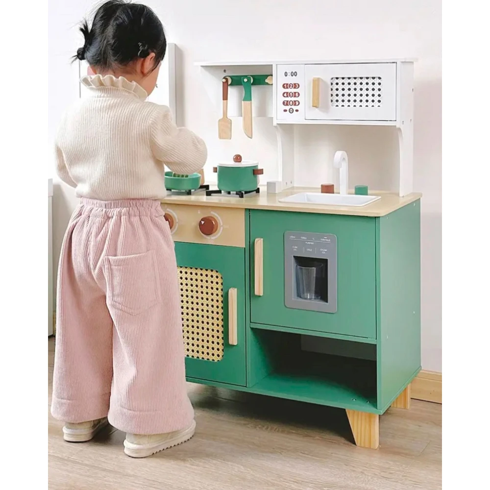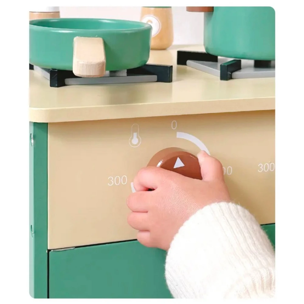 Introduce your kids to the most important room in the house with our vintage design play kitchen. Its knobs gives a realistic touch with the clicking sounds they make whenever the little hands turn them around. It also features a sink with a faucet, a shelf to keep the salt & pepper on and 3 hooks for the spatulas. In addition to that, it has plenty of space underneath to use it as storage.Comes with a set of accessories as well.