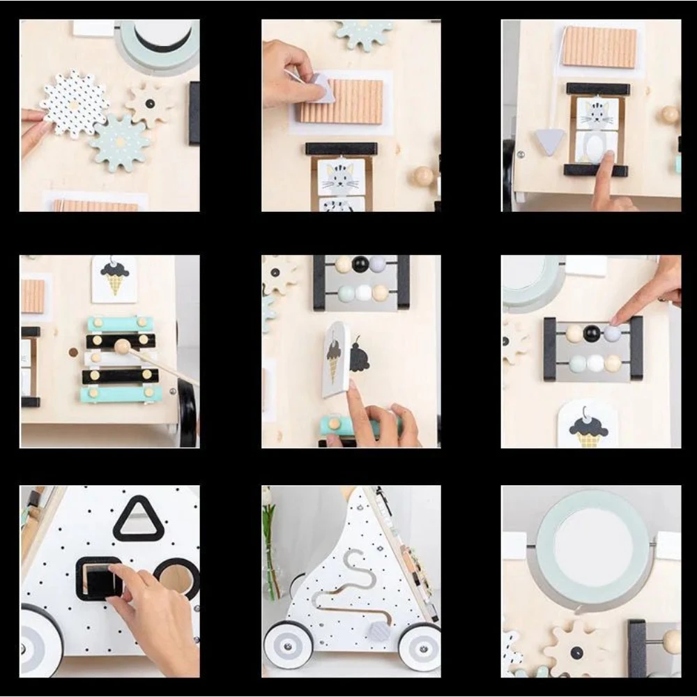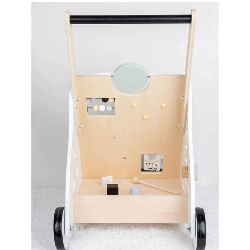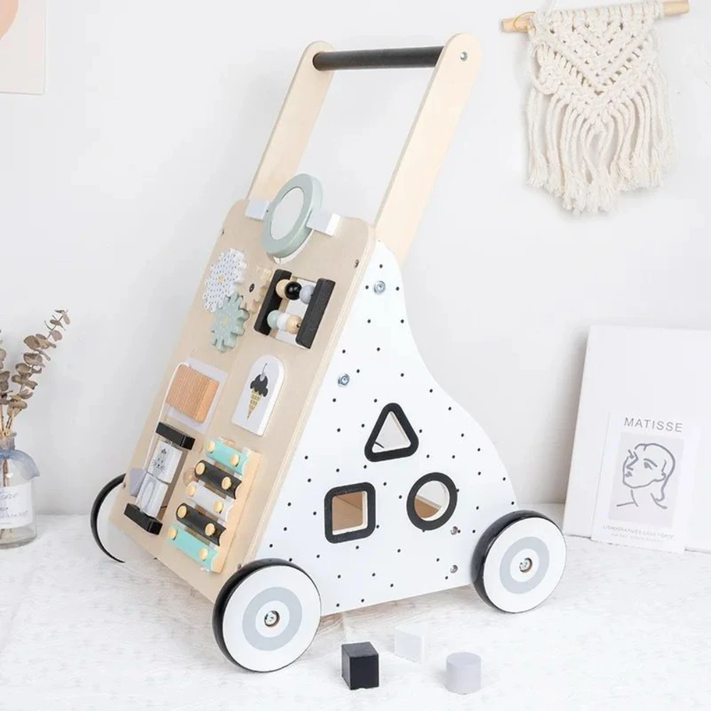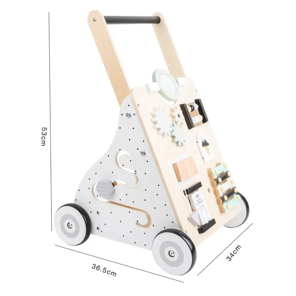 Introducing our Walker with Busy Board, the perfect companion for your little explorer's first steps. This beautifully designed and thoughtfully crafted wooden walker not only helps your child take those crucial first steps but also engages their curious mind with an array of stimulating activities. The Walker is designed to support and enhance your child's motor skills and coordination. It provides stability and confidence, making those first steps a joyous adventure. The attached busy board is a world of wonder for little hands. With a variety of sensory elements such as buttons, gears, knobs, and mazes, it sparks curiosity, fosters problem-solving skills, and enhances fine motor control. This walker is designed to grow with your child. It serves as a fun playmate for babies just starting to pull themselves up, and as they grow, it transforms into a sturdy walker that helps them take confident steps. The Walker with Busy Board is an ideal gift for birthdays, baby showers, or any special occasion. It's a thoughtful present that combines entertainment and learning in one delightful package. As your child takes their first steps with the walker, they're not just exploring the world around them; they're also gaining a sense of independence and self-assurance. We believe in the importance of sustainability, thus our walker is built to withstand the test of time and can be passed down from one generation to the next, promoting both eco-consciousness and enduring memories.