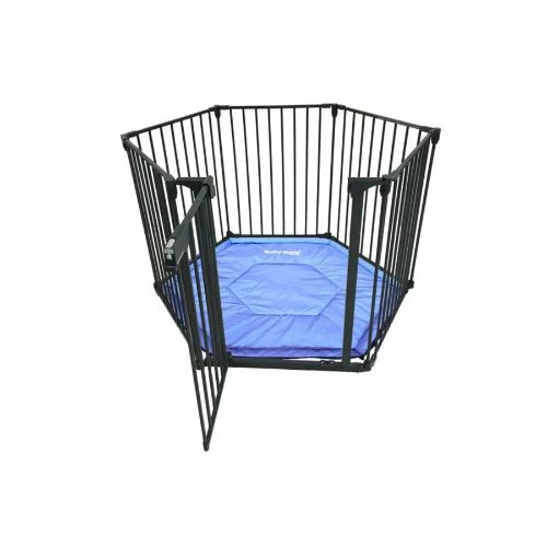 Create a secure, versatile, and comfortable play space for your little one with the Baby Safe Convertible Playpen with Mat in Grey, brought to you by SAMBOX. This multifunctional 3-in-1 play yard easily transforms into a freestanding playpen, baby safety gate, or room barrier-perfect for creating safe zones in any part of your home, including around fireplaces or stairways. The playpen includes a soft, cushioned mat to make playtime and tummy time extra cozy, and the spacious six-panel design can be adjusted or expanded to suit your space. Whether placed on carpet, tiles, or hardwood floors, the rubber feet prevent scratches and slipping. Made of durable metal with secure double-locking mechanisms and a one-handed door latch for easy access, the Baby Safe Playpen ensures maximum safety and convenience. The included blue cushion mat fits snugly inside, providing a soft surface for babies or even small pets. With hardware-mounting options and independently adjustable panels, this playpen offers safety and flexibility for growing families.