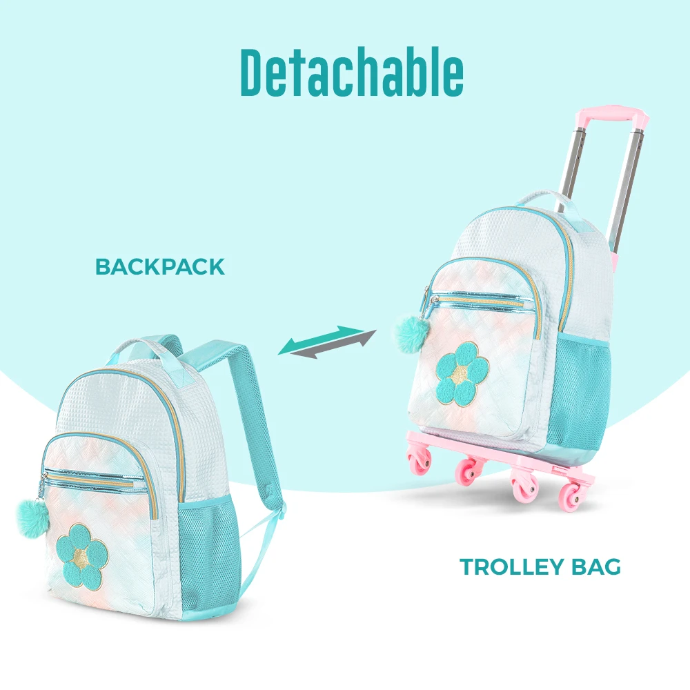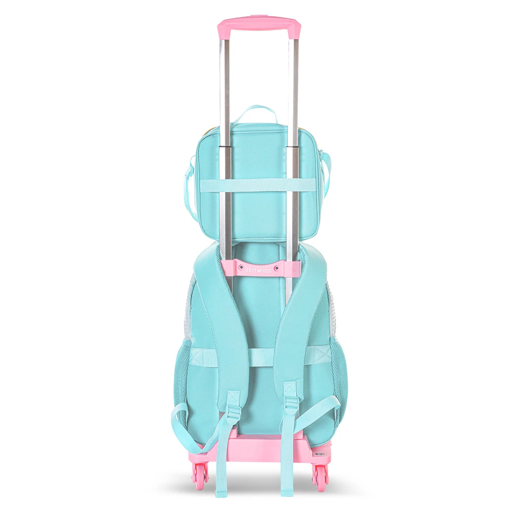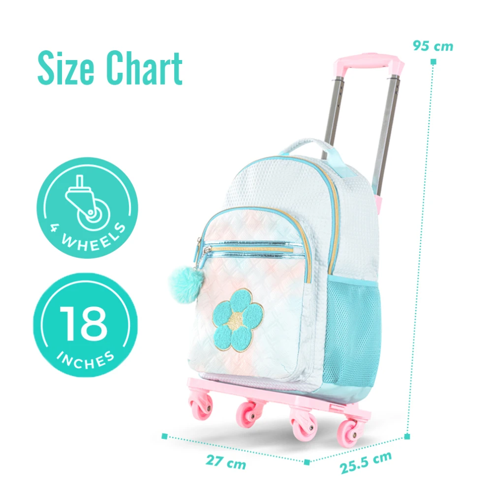 The Eazy Kids 18" 4-Piece 4-Wheel Trolley School Backpack Set in Flora Green brings a refreshing floral vibe to school gear. This spacious set includes an 18-inch trolley backpack, matching lunch bag, pencil case, and bottle holder, perfect for organizing school essentials in style. The 4-wheel design ensures smooth movement, while the extendable handle and padded straps offer comfort in every journey.