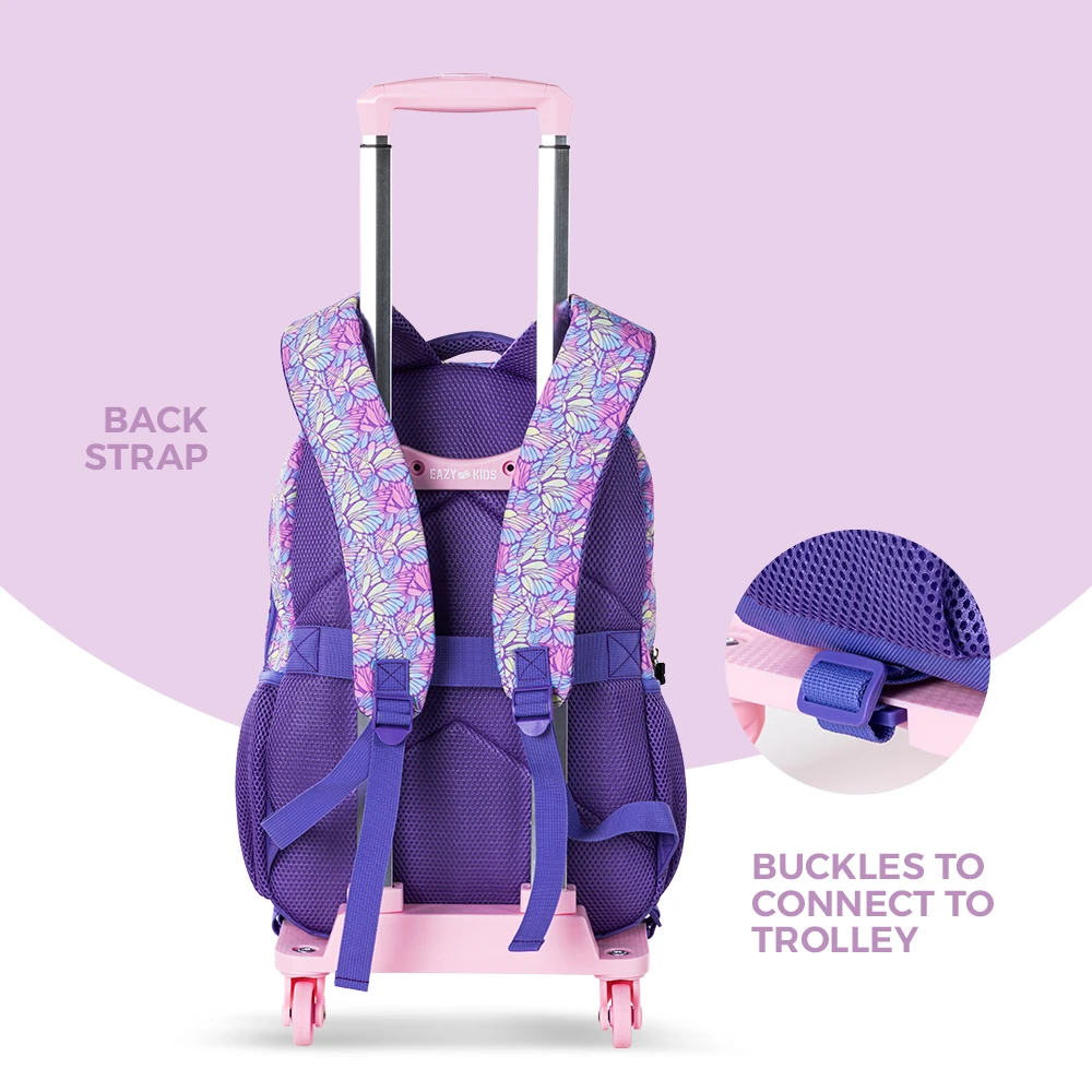 eazy kids,butterfly purple trolley bag,3d school backpack,18 inch school bag,9 piece school set,school bag with lunch bag,school bag with pencil case,girls trolley backpack,stylish school bag,water resistant backpack,durable school bag,large compartment school bag,kids back to school,rolling school bag,multi pocket school bag,comfortable school backpack,lightweight school bag