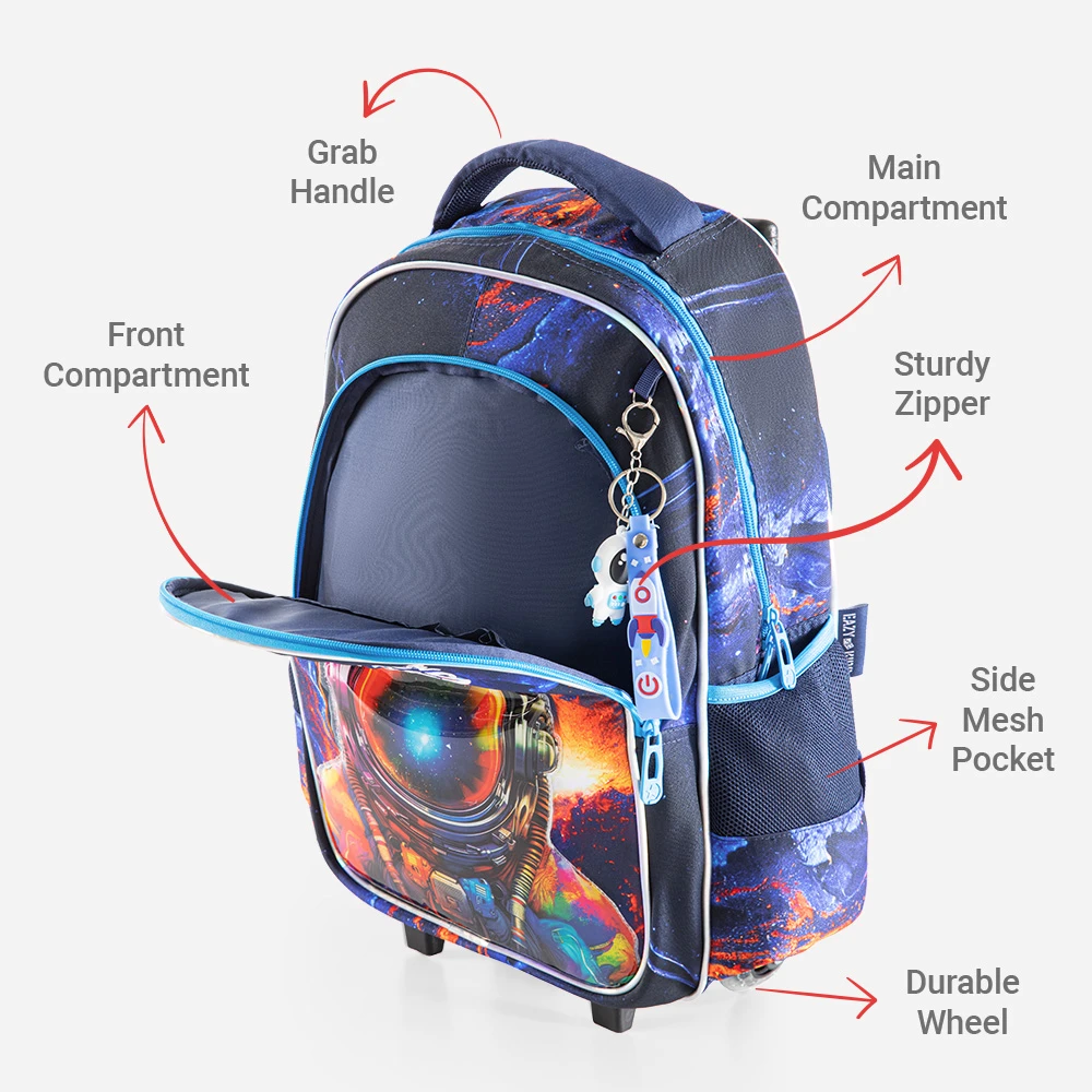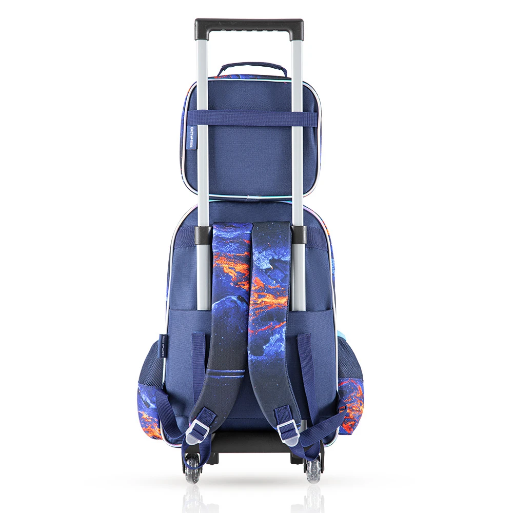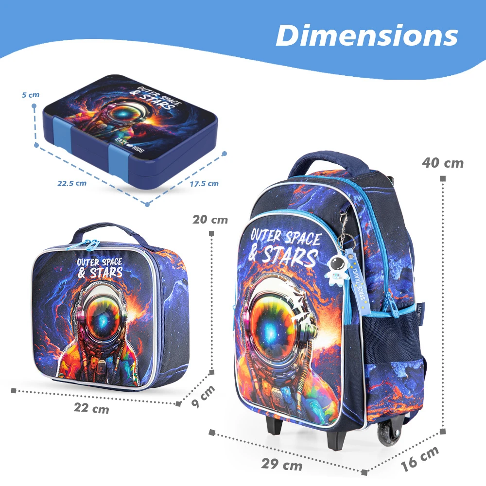 trolley school bag set, outer space design, blue school bag, 18 inch trolley bag, bento lunch box, leak proof lunch box, insulated lunch bag, matching pencil case, smooth rolling wheels, adjustable trolley handle, durable school set, organized school gear, kids school accessories, multi compartment bag, stylish school set, novelty school design, travel friendly school bag, coordinated school set, easy clean school bag, practical school gear