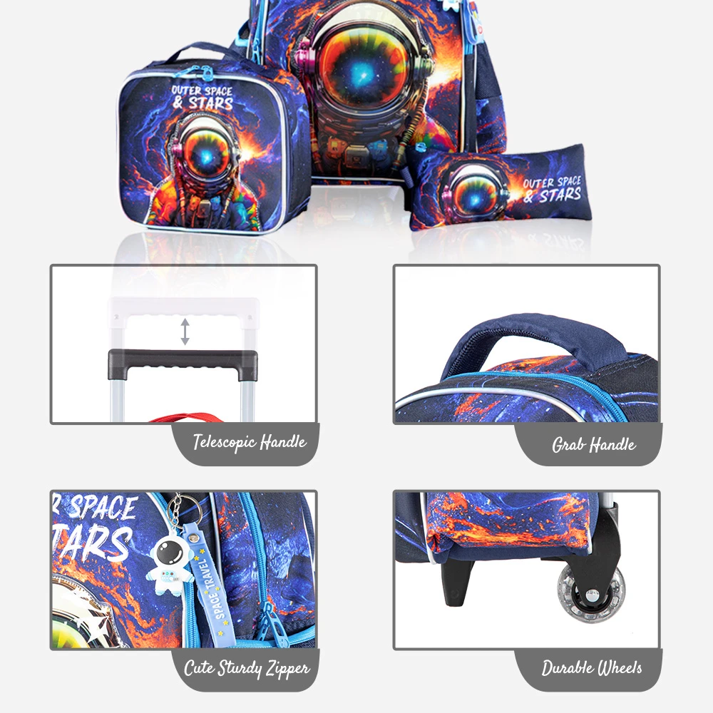 Eazy Kids 18Inch Set of 4 Trolley School Bag with Bento Lunch Box, Lunch Bag and Pencil Case - Outer Space Blue