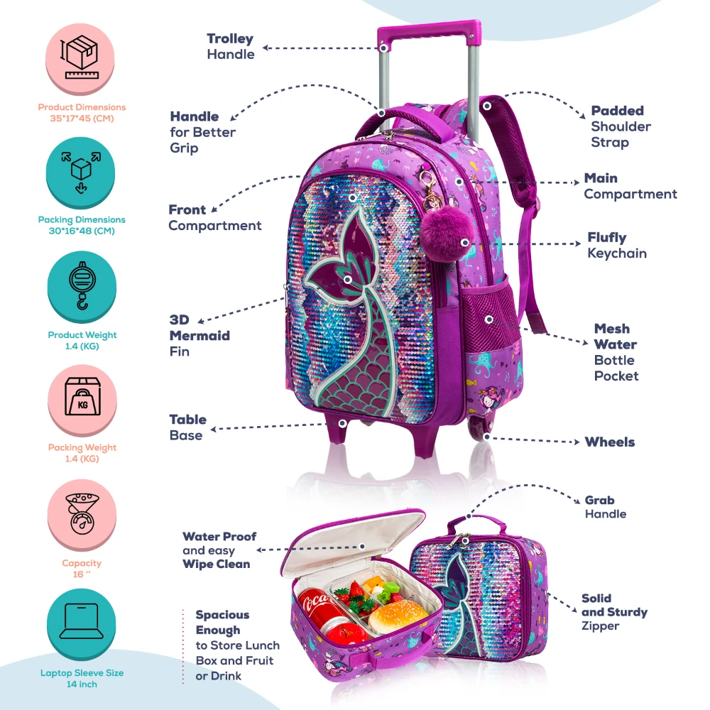 trolley school bag set, mermaid purple school set, glitter school accessories, 18 inch trolley bag, glitter bento lunch box, glitter 550ml water bottle, lunch bag combo, matching pencil case, rolling school bag, retractable trolley handle, stylish kids bag set, girls back to school kit, insulated lunch carrier, kids hydration bottle, leakproof water bottle, multi compartment lunch box, colorful school set, premium kids trolley bag, durable school set, school travel gear