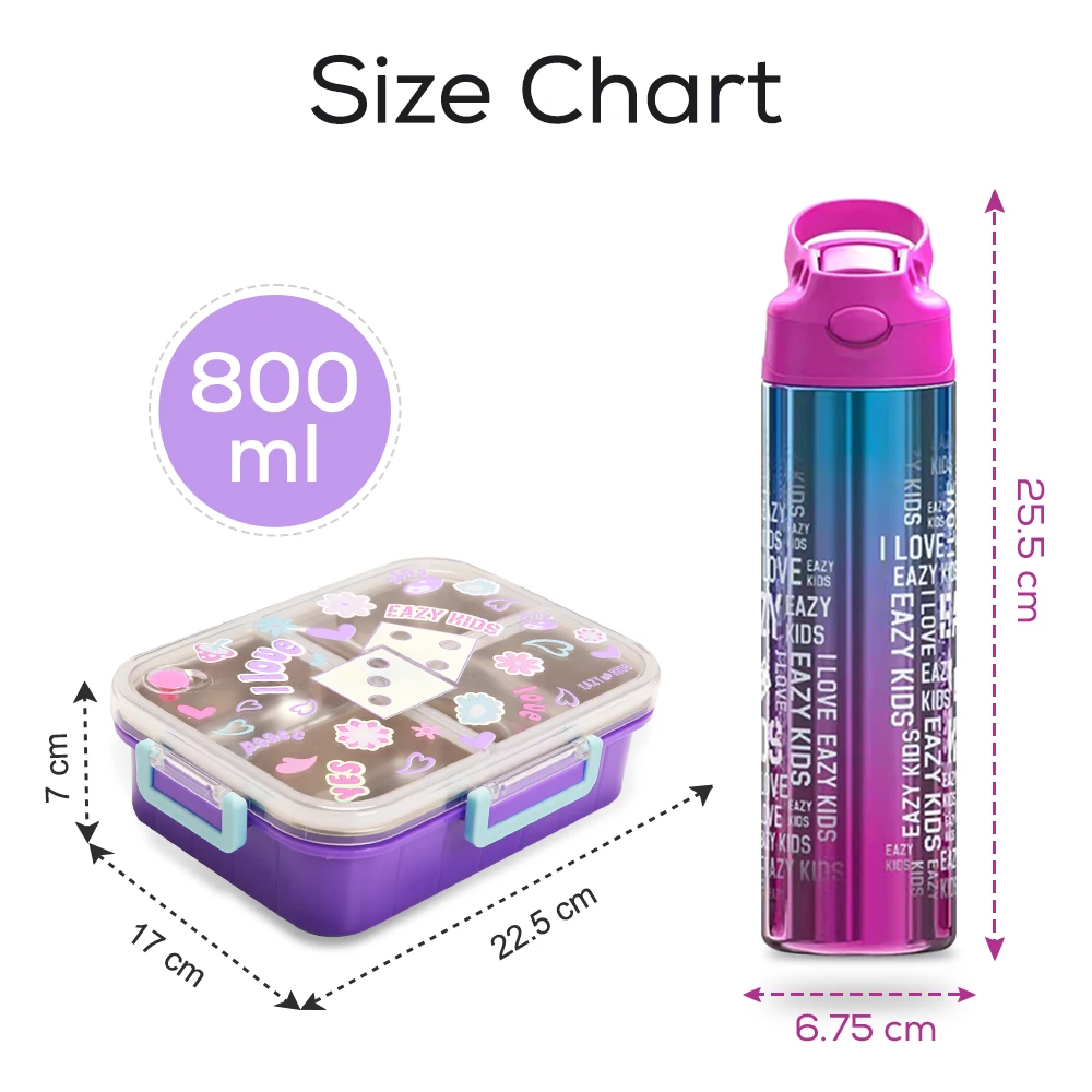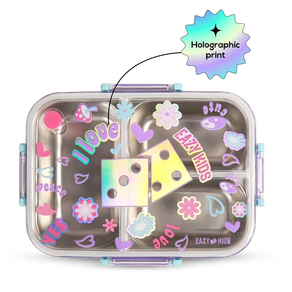eazy kids bento lunch box,floral purple lunch box,stainless steel bento box,3 compartment lunch box,kids lunch box with bottle,eco friendly kids lunch box,school lunch essentials,kids stainless steel set,leakproof lunch box,purple bento lunch box