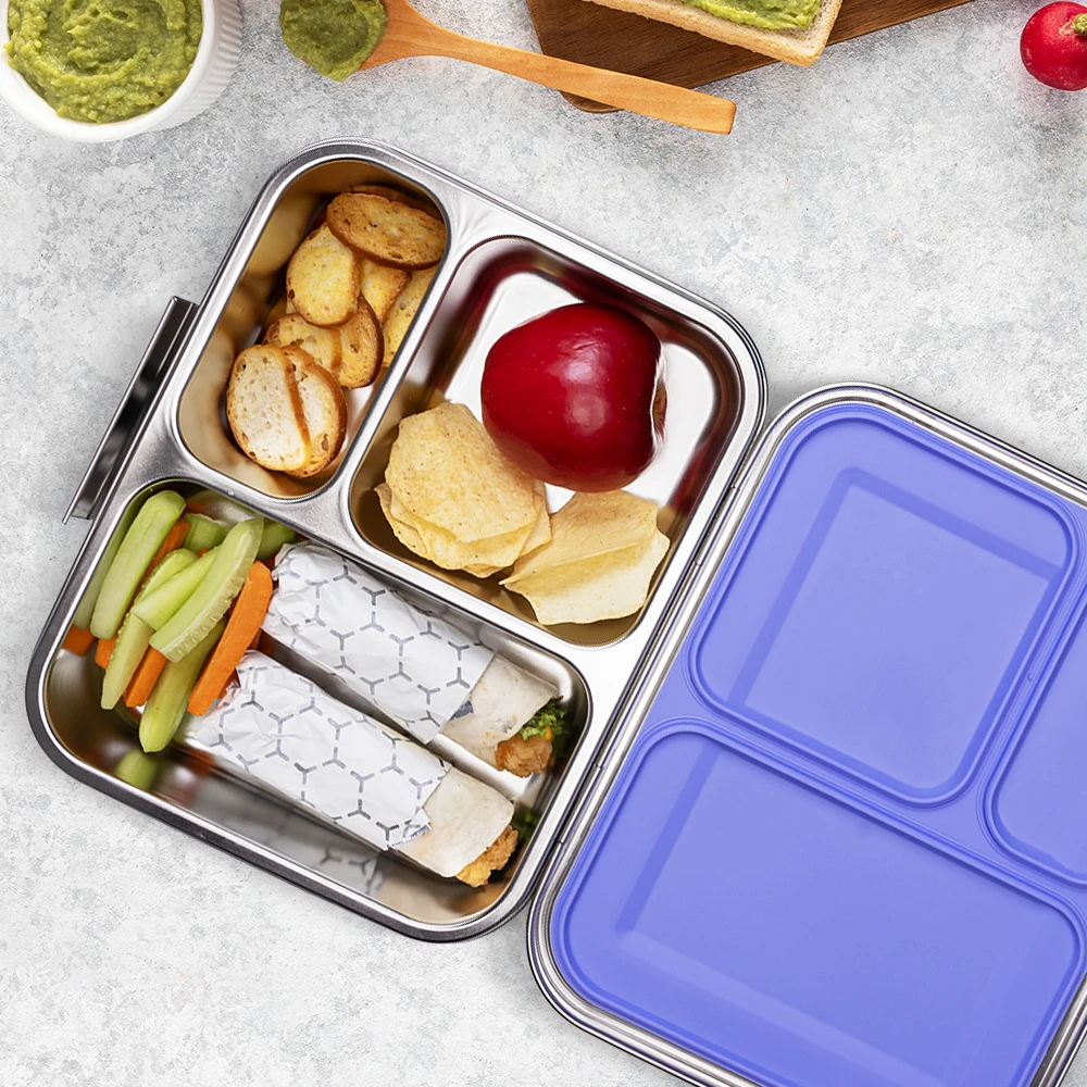 steel bento box, 3 compartment lunch box, purple lunch box, stainless steel container, leakproof lunch box, silicone seal lid, organized meals, eco friendly lunch box, reusable lunch box, easy open lid, dishwasher safe, microwave compatible tray, school lunch box, travel lunchbox, food storage box, spill proof lunch box, sturdy meal box, stylish design, compact lunch container, practical bento box