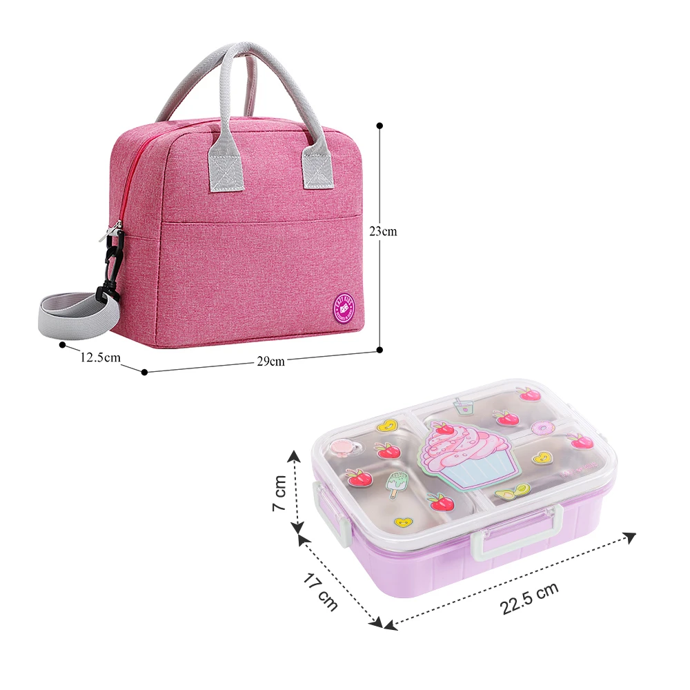 Eazy Kids 3-Compartment Stainless Steel Bento Lunch Box 800ml with Lunch Bag - Cup Cake Purple
