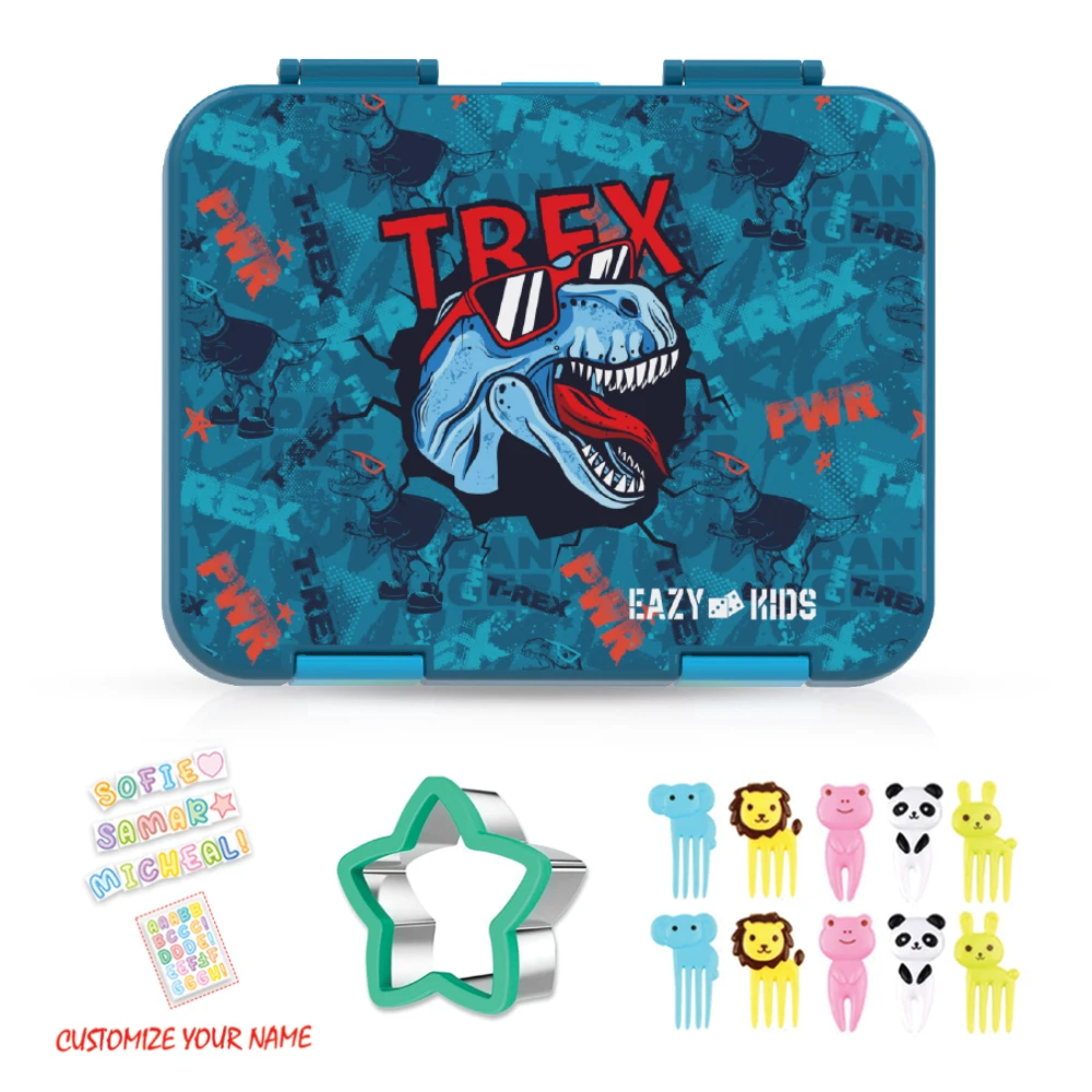 bento lunch box, convertible lunch box, trex design lunch set, dinosaur lunch box, blue lunch box, leak proof lunch box, insulated lunch bag, sandwich cutter set, fun lunch accessories, kids meal prep, eazy kids lunch set, safe lunch box, durable lunch gear, reusable lunch box, novelty lunch set, travel lunch set, stylish lunch kit, organized lunch storage, easy clean lunch box, multi compartment lunch box