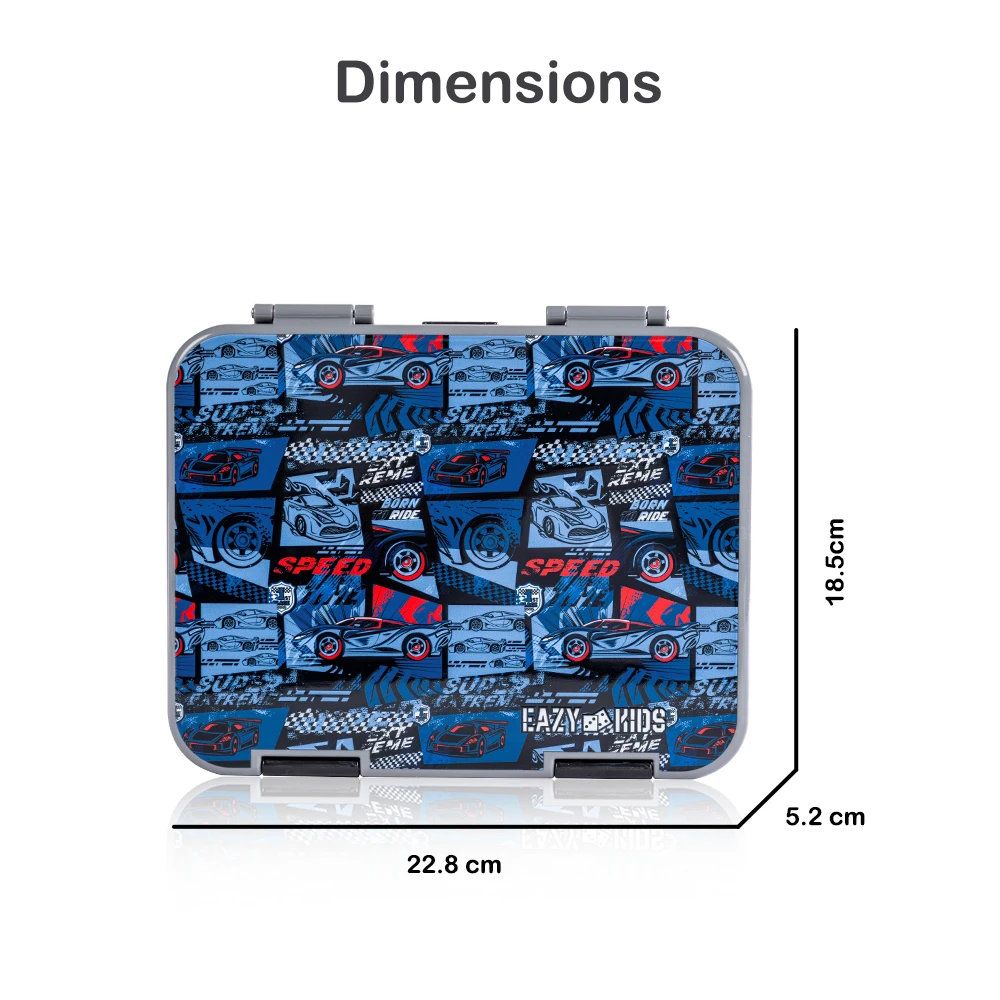 Fuel mealtime excitement with the Car Racing Blue Convertible Bento Lunch Box from Eazy Kids. With a flexible 6 or 4 compartment design, stainless steel cutlery, and alphabet stickers for customization, it’s perfect for kids who love speed and adventure.
