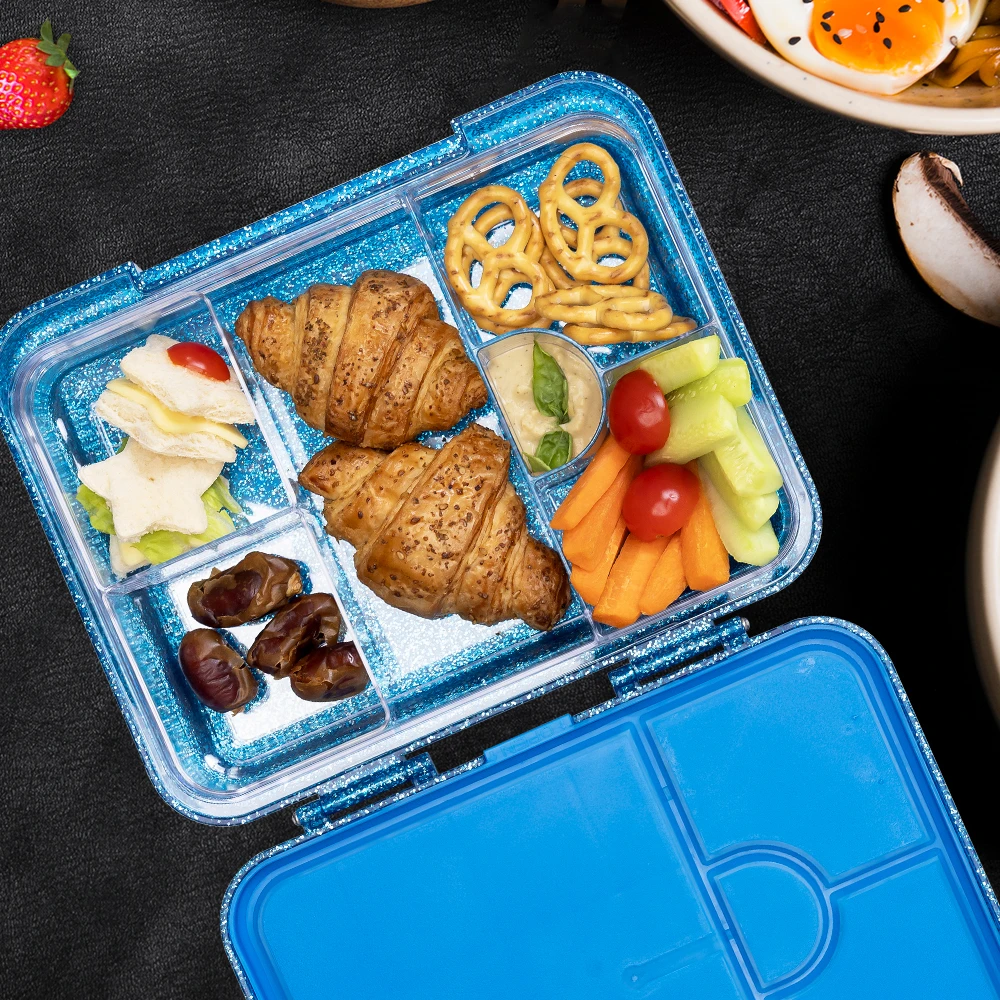 convertible bento box, glitter blue lunch box, 6 compartment bento, 4 compartment bento, leakproof lunch box, pp lunch box, school lunch container, meal prep box, adjustable compartments, easy clean lunch box, microwave safe tray, dishwasher safe, eco friendly lunch box, glitter finish, portion control box, versatility lunch box, reusable lunch box, travel lunch container, kids bento box, fun lunch box
