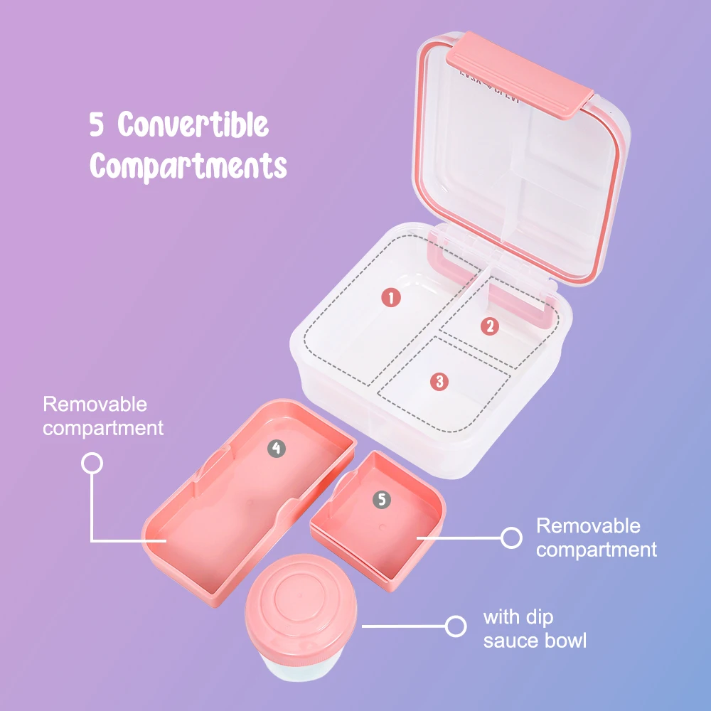 Pack delicious meals with care using the Eazy Kids pink convertible bento lunch box. With customizable compartments—3, 4, or 5—you can separate different foods easily for a balanced and mess-free meal. The included 150ml gravy bowl fits neatly inside, perfect for sauces or liquid sides. Made with high-quality, BPA-free materials, this lunch box features a leak-proof, child-friendly design and secure locking clips. Ideal for everyday use, it supports healthy eating habits while adding a cheerful pop of color to lunchtime.