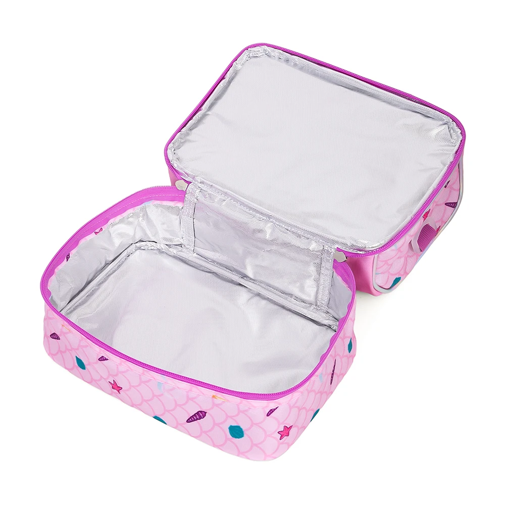 dual compartment lunch bag, mermaid design, purple lunch bag, insulated lunch bag, thermal insulation, foam lining, dirt proof fabric, easy clean exterior, detachable strap, adjustable shoulder strap, kids meal organizer, stylish lunch tote, school lunch accessory, travel lunch bag, novelty lunch bag, vibrant design, lightweight lunch bag, functional lunch tote, durable lunch accessory, eazy kids bag