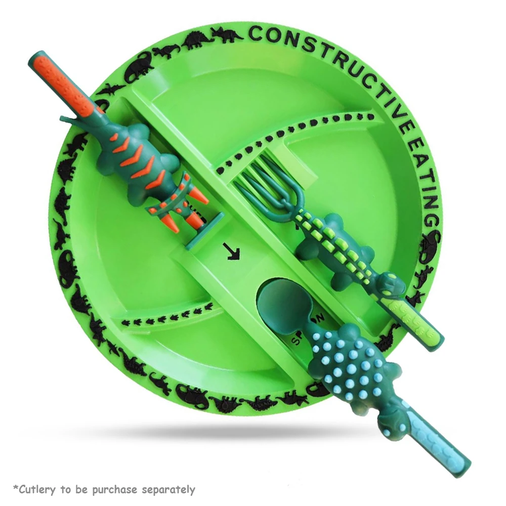 eazy kids plate, dinosaur green plate, toddler dinnerware, bpa free plate, dinosaur theme, self-feeding plate, segmented plate, fun dining plate, independent eating aid, microwave safe plate, dishwasher safe plate, fine motor supporting plate, imaginative mealtime, non-toxic plastic plate, kids plate design, safe dinnerware, easy clean plate, playful eating, child mealtime tool