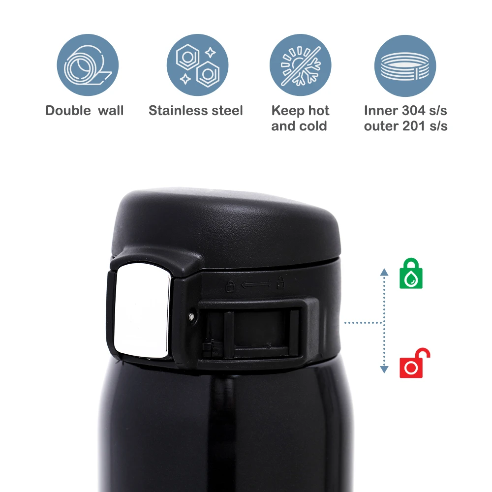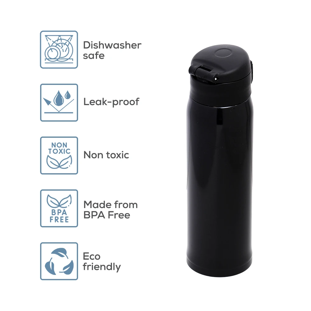 insulated water bottle, black bottle, 500ml bottle, travel water bottle, stainless steel bottle, double wall insulation, leak proof lid, flip top spout, bpa free, phthalate free, food grade steel, eco friendly bottle, reusable water bottle, lightweight design, spill proof, temperature control, sleek design, durable finish, travel accessory, portable hydration