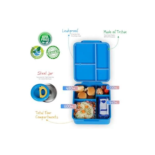 Make meal times easy and fun with the Eazy Kids Jumbo Bento Lunch Box in Blue, ideal for moms who want to pack hot and cold foods together without the hassle of multiple containers. This jumbo-sized lunch box features four spacious compartments and a stainless steel insulated airtight jar that is leakproof and can keep food warm for 5 to 7 hours or cold for up to 12 hours, ensuring your child enjoys fresh meals throughout the school day. Made from Tritan, a BPA-free and plastic-free material, this durable lunch box is perfect for kids and teens. The insulated jar can be used inside the box or carried separately for added convenience. Stylish and practical, its a great choice for school, travel, or outings.