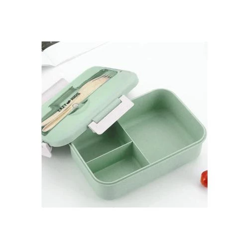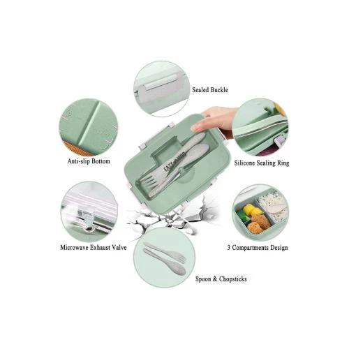 bento lunch box green, wheat straw lunch box, eco friendly food container, leakproof bento box, BPA free lunch box, lunch box with cutlery, school lunch box for kids, 3 compartment lunch box, reusable kids lunch box, eazy kids lunch container