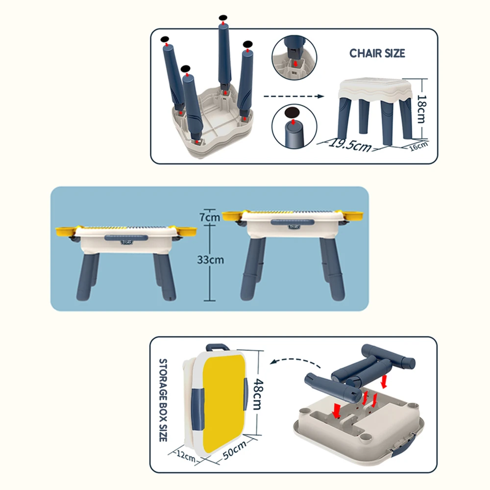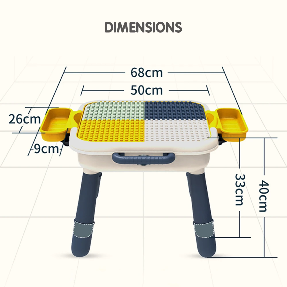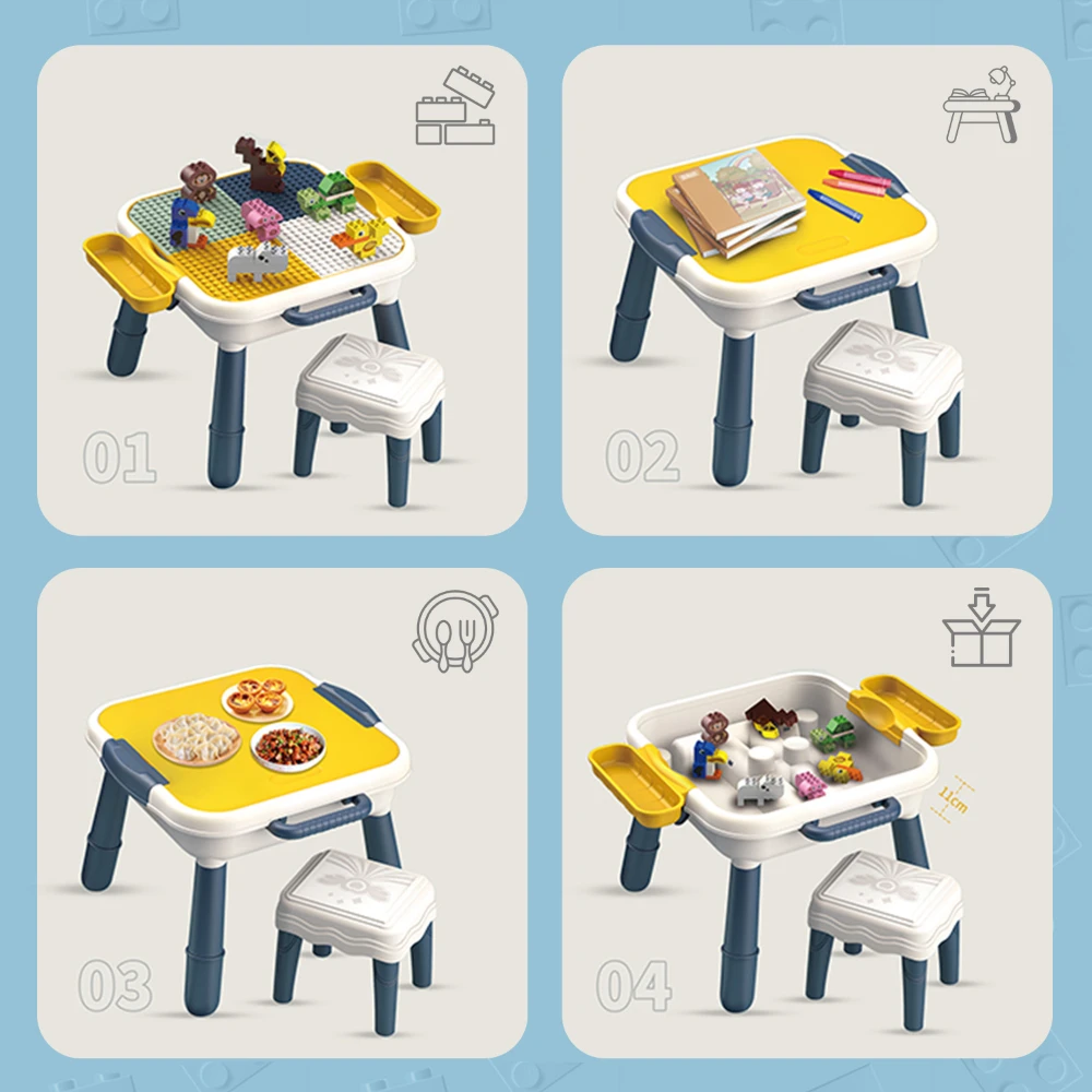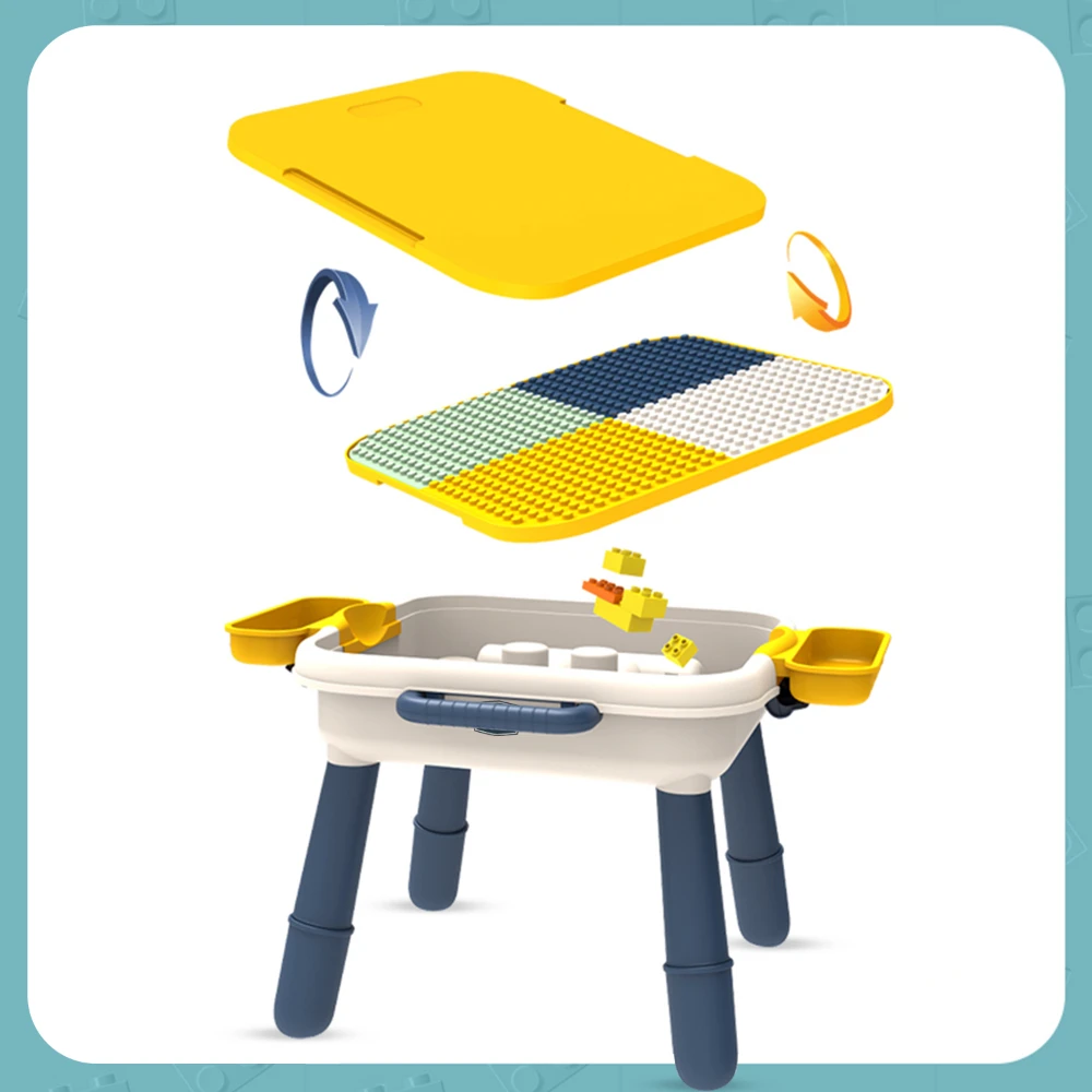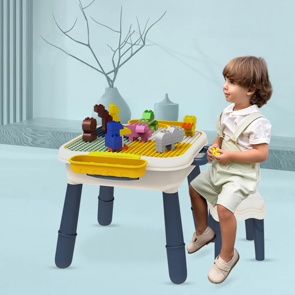 kids activity table, 4-in-1 play table, building blocks with stool, multifunctional toddler table, creative play furniture, indoor outdoor kids toy, early learning toy, blue table set, kids furniture, block play station