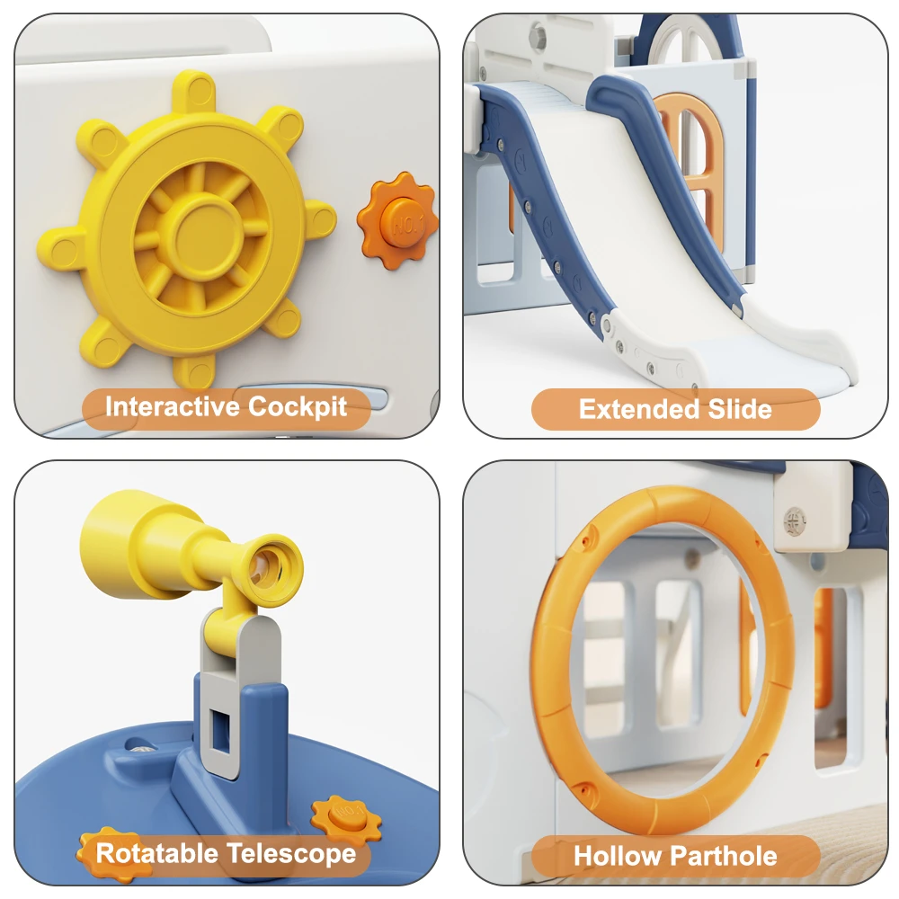 boat themed playhouse, kids activity slide, playhouse with telescope, basketball and slide playset, blue play house for kids, little story boat house, toy storage play set, pretend play structure, toddler adventure set, multi-activity playhouse