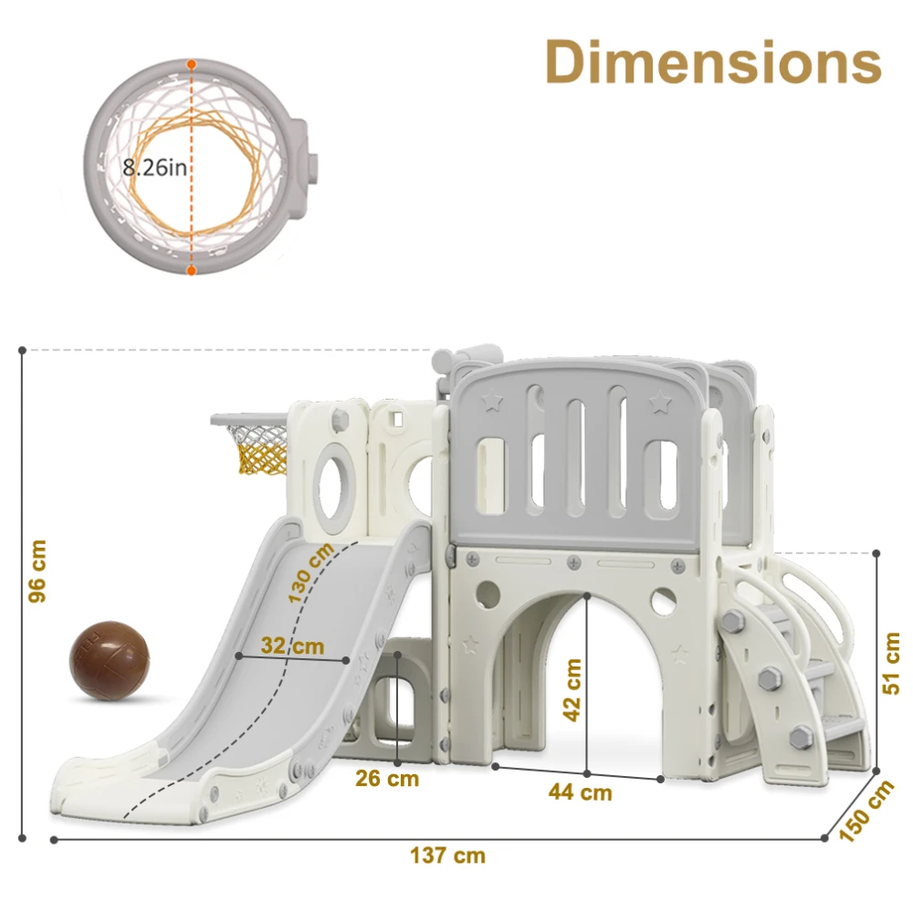 kids play house, playhouse with slide, toddler activity center, indoor play set, kids basketball play set, little story slide set, toy storage playhouse, compact play structure, grey play set, multi-functional play house