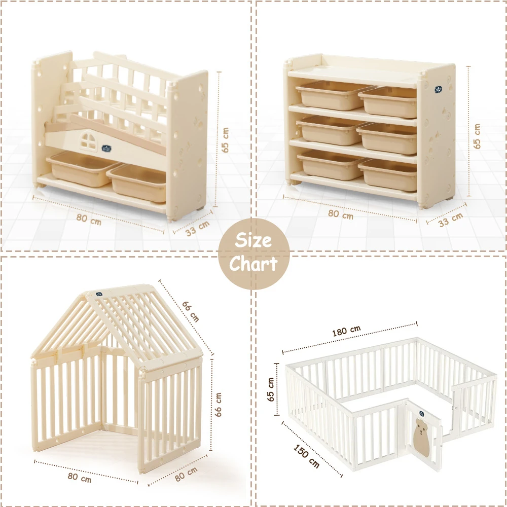 The Little Story portable playpen in white combines multiple play and storage functions into one innovative design. Featuring a safe enclosed play space, an integrated bookshelf, toy storage compartments, and a charming play house section, it offers children a versatile and engaging environment. This multi-use design keeps play areas organized while encouraging imaginative play.