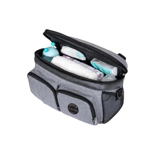 stroller organizer bag, baby stroller travel bag, convertible diaper organizer, little story stroller bag, grey stroller bag, large capacity diaper organizer, stroller pouch for baby items, baby bottle holder bag, travel diaper organizer, stroller caddy with strap