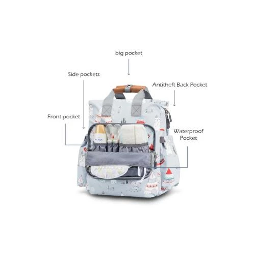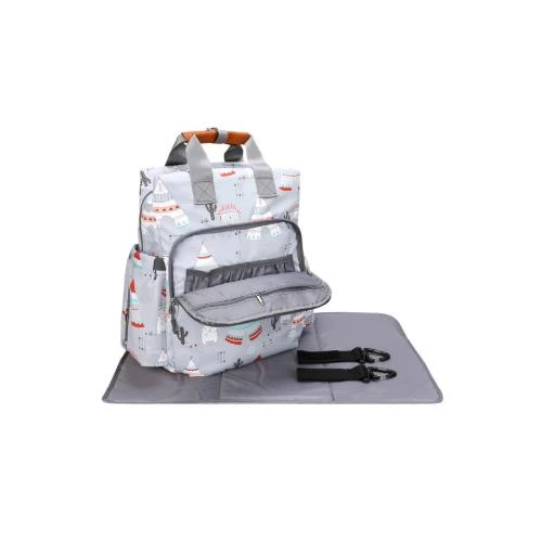 little story diaper backpack, polar bear grey diaper bag, insulated bottle pockets, waterproof diaper backpack, maternity messenger bag, stroller hooks included, baby organizer bag, diaper changing mat, durable baby backpack, baby essentials bag