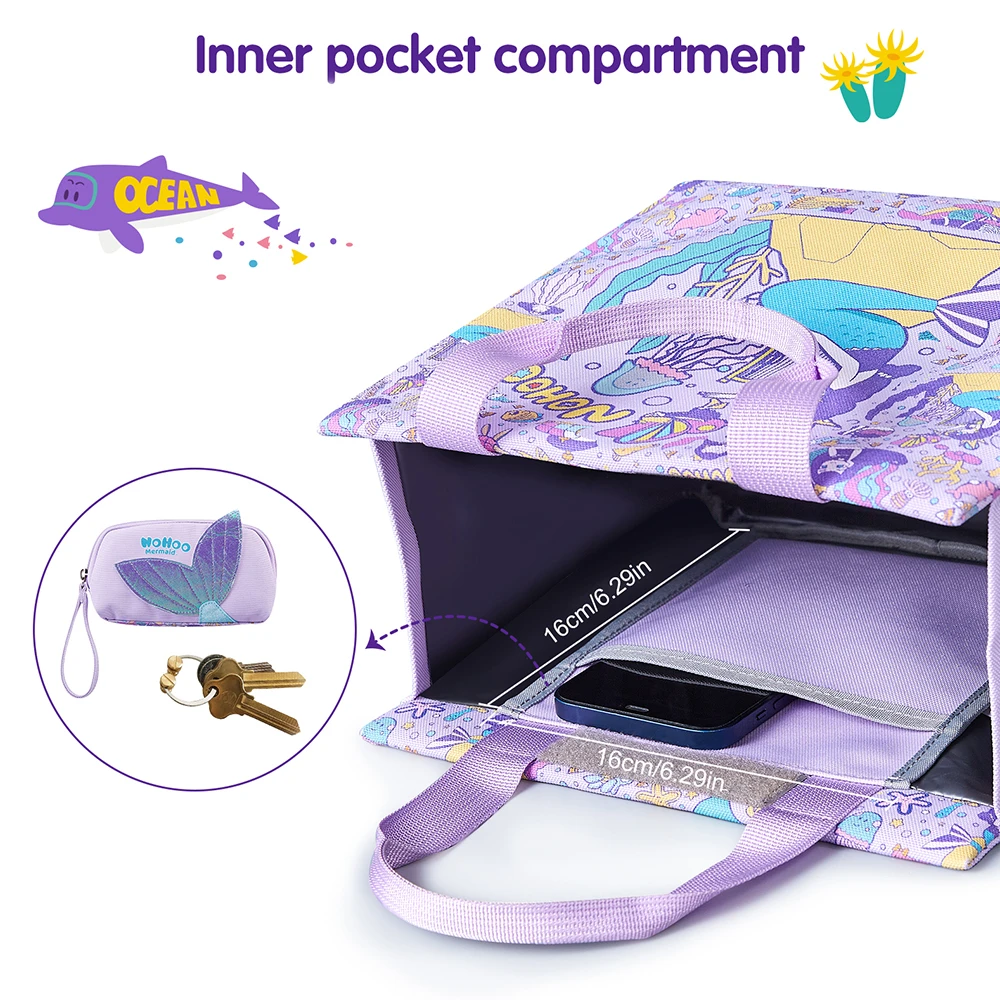Make every day feel like an underwater adventure with the Nohoo mermaid-themed 16-inch backpack and matching handbag combo in enchanting purple. The backpack features spacious storage compartments, ergonomic padded straps, and a cushioned back panel for comfortable daily wear. Built from water-resistant materials, it resists spills and is easy to maintain. The stylish mini handbag adds extra convenience, ideal for carrying lunch, snacks, or personal items. With a secure zipper and soft top handle, it offers flexible usage for school or outings. Together, this coordinated combo merges mermaid-inspired charm with functional design to enhance every school routine.