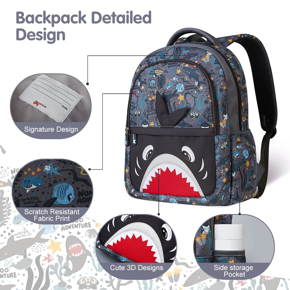 school bag combo, shark design, grey backpack set, 16 inch backpack, insulated lunch bag, water resistant, ergonomic straps, padded back panel, spacious backpack, easy to clean, nohoo shark set, zipper compartments, school-ready gear, lightweight combo, novelty design, daily school essentials, fun school combo, multifunctional set, coordinated lunch bag, everyday backpack set