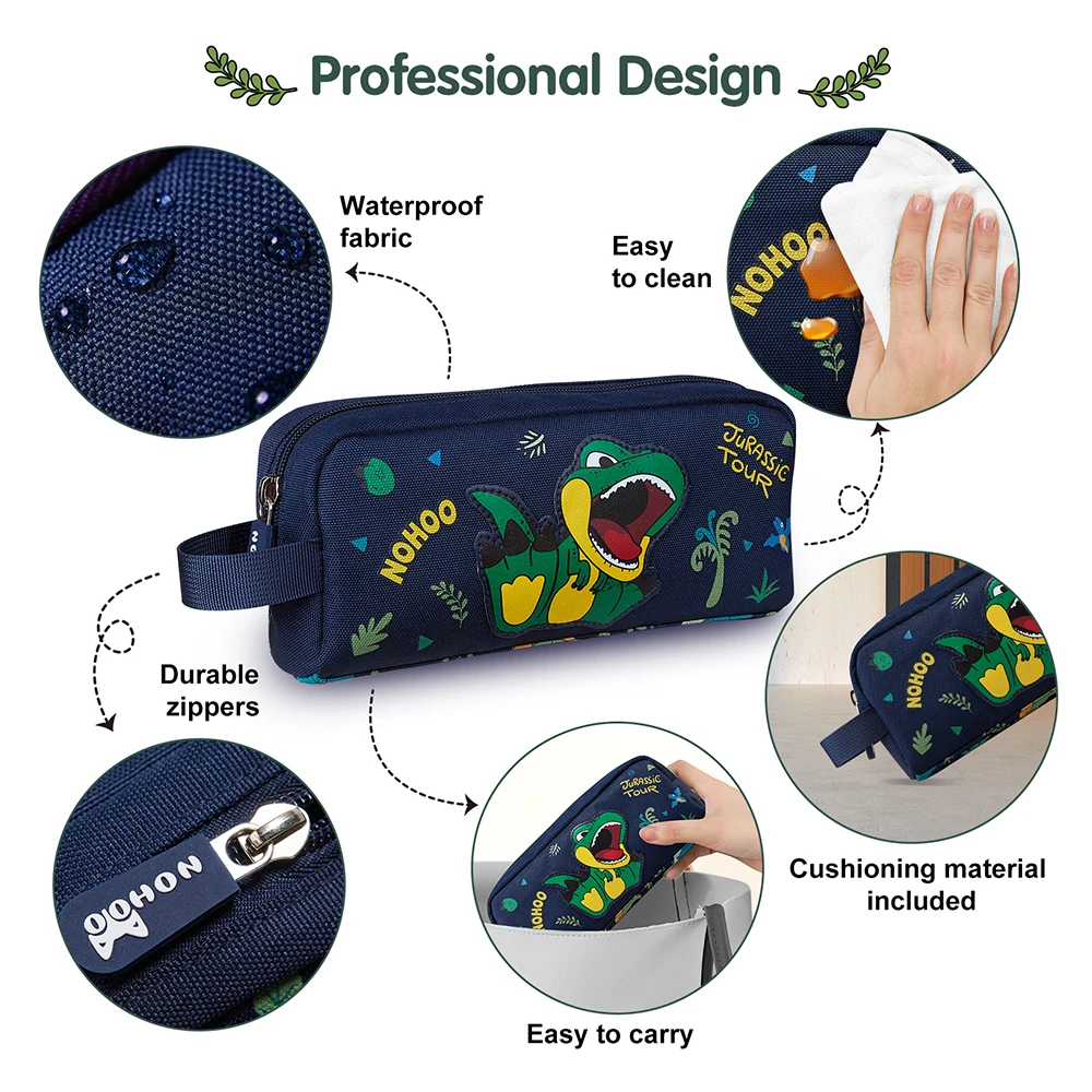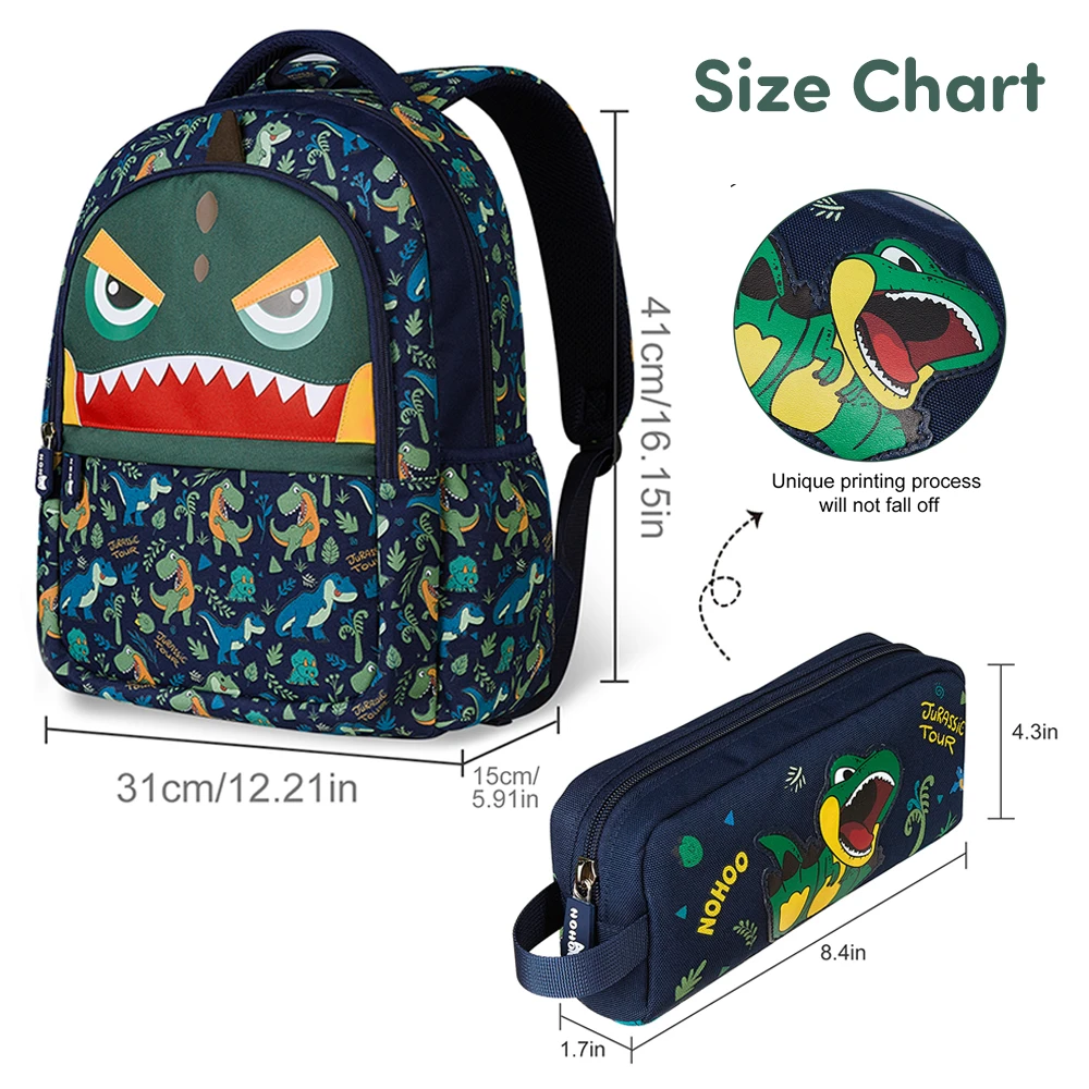 Unleash adventure at school with the Nohoo dino-themed 16-inch backpack and pencil case combo in energetic green. Designed for everyday durability and comfort, the backpack features multiple compartments, strong zippers, and padded shoulder straps for a secure, ergonomic fit. The water-resistant material keeps contents protected from spills and weather. The matching dinosaur pencil case adds a fun way to store writing tools and art supplies. With coordinated visuals and easy-to-clean surfaces, this combo brings together utility and style for a dynamic school-ready set that keeps everything organized.