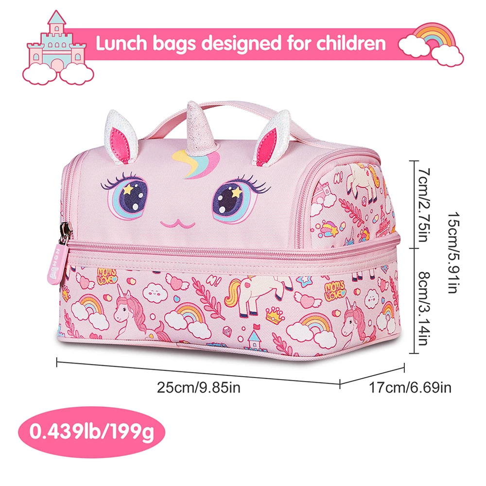 insulated lunch bag, unicorn design, pink lunch bag, dual compartment, thermal insulation, easy-clean fabric, oxford fabric, sturdy zipper, durable material, fun lunch bag, easy carry handle, meal organization, wipe-clean lining, everyday lunch bag, novelty lunch bag, practical design, colorful lunch bag, outdoor lunch tote, family lunch gear, nohoo lunch bag
