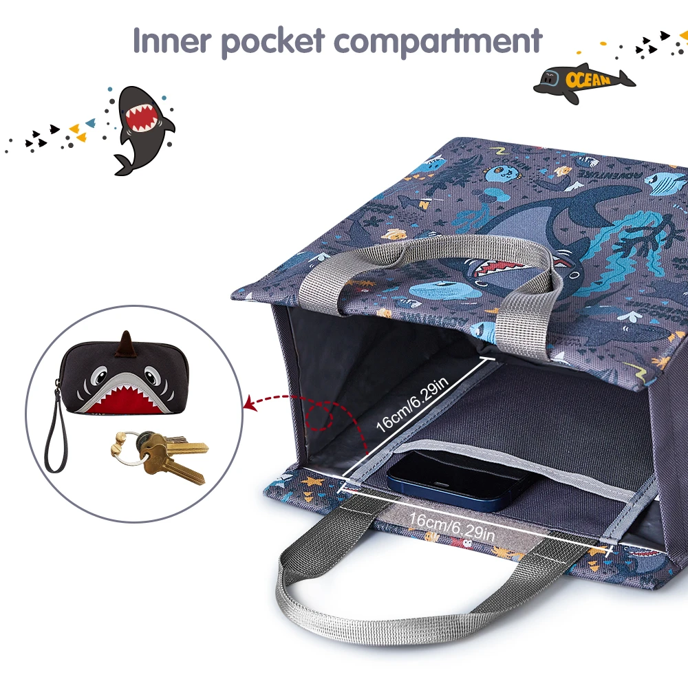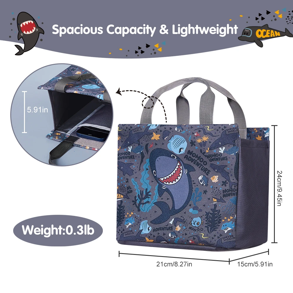 tuition bag, hand lunch bag, shark design, grey bag, water resistant, compact tote, oxford fabric, easy to clean, secure zipper, nohoo shark bag, school lunch bag, daily use bag, multifunctional kids bag, lightweight carrier, padded handle, stylish tote, novelty kids bag, travel lunch bag, everyday carry bag, kids accessory