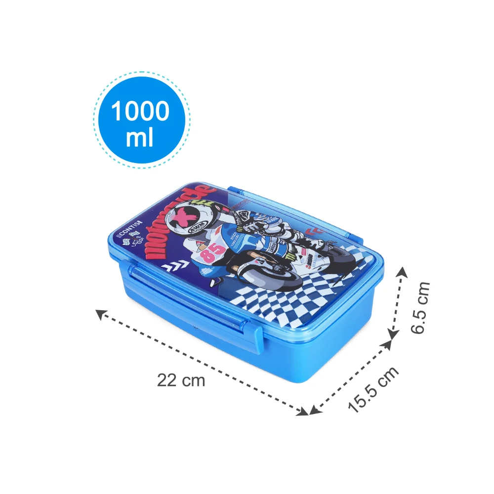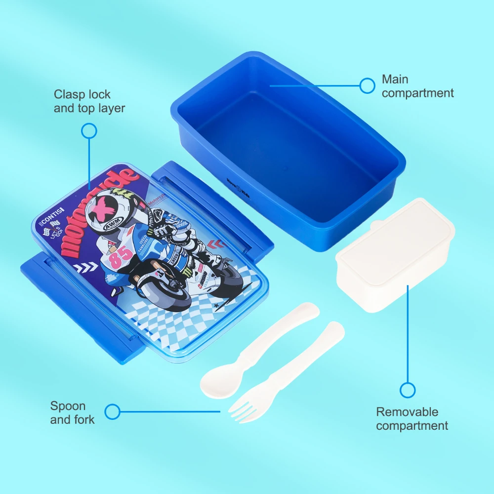 bento lunch box, motorbike lunch box, blue food container, lunch box with cutlery, food-safe lunchware, nova kids lunch box, sectioned meal tray, bold design lunch box, lunch carrier for school, reusable plastic lunch box, compact food container, leak-resistant closure, easy-open lunch box, lunch box with utensil tray, stylish kids lunch box, durable lunchware, snack compartment box, mealtime storage, adventure lunch box, motorbike design