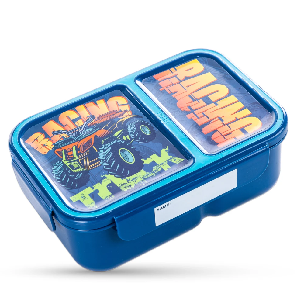 racer lunch box,kids bento lunch box,2 compartment lunch box,school lunch container,boys lunch box,food storage for kids,leakproof kids lunch box,compact lunch box,blue lunch box for boys,racing theme lunch box,eco friendly kids lunch box,bpa free kids lunch box,durable lunch box for school,fun lunch box for kids