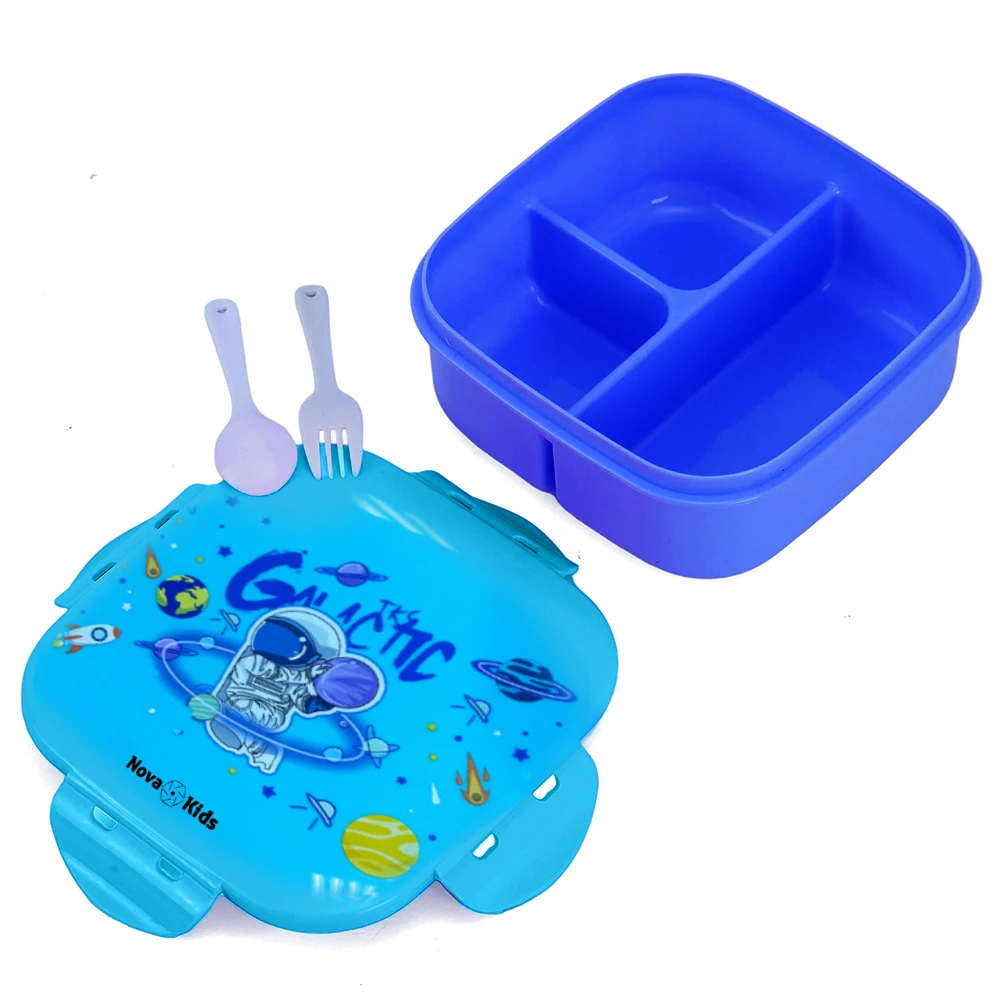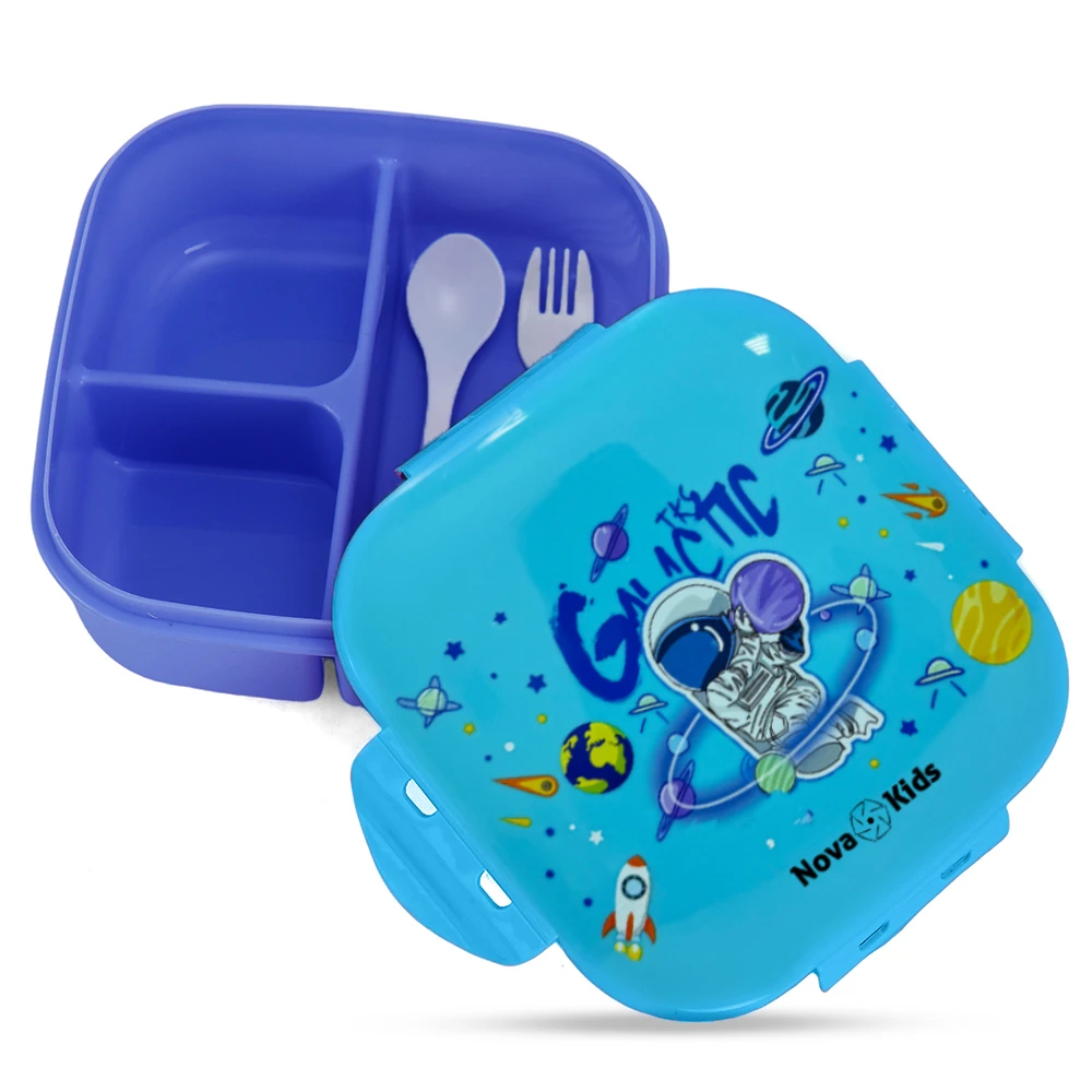 bento lunch box, astronaut blue, 1000ml lunch box, square lunch box, three compartment box, included spoon and fork, food grade material, bpa free, phthalate free, leak resistant lid, silicon seal, lightweight lunch box, washable container, school lunchbox, reusable lunch container, durable bento box, fun print design, themed lunch box, balanced meal container, compact lunch kit