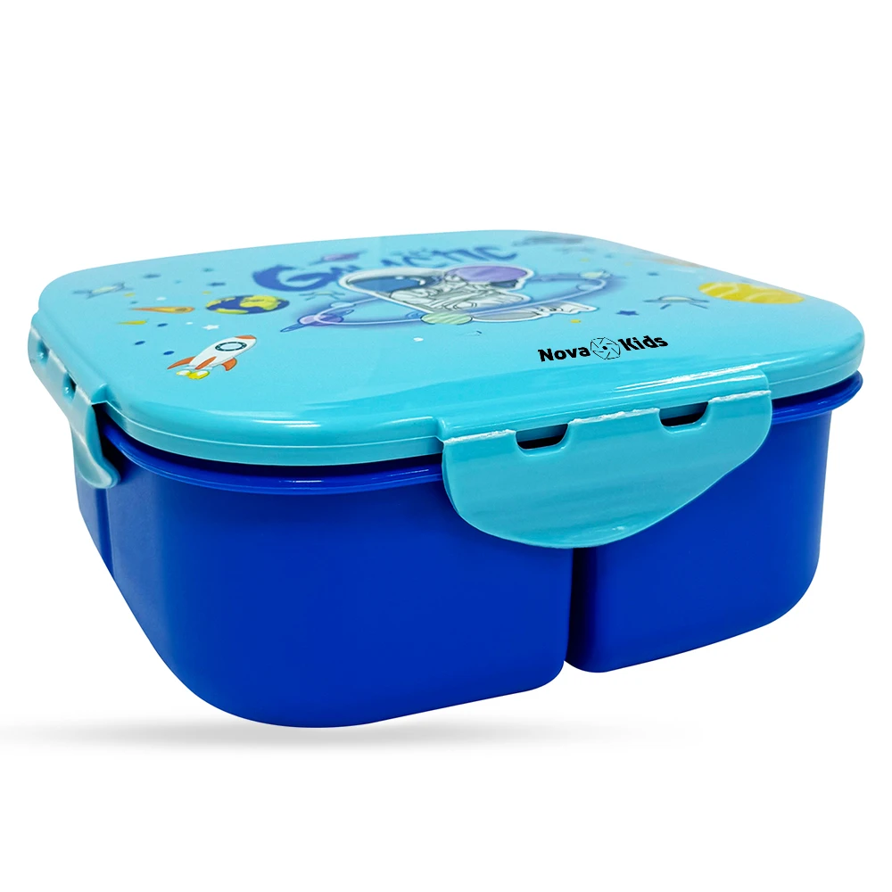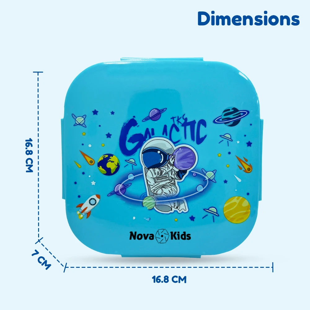 The Nova Kids square bento lunch box in astronaut blue is crafted for vibrant lunch routines. Designed with three compartments and including a spoon and fork, it helps portion meals for balanced nutrition. Made from food-grade materials free from BPA and phthalates, it ensures safe and hygienic storage. A secure clasp lock and a silicon-lined lid help prevent spills, making it ideal for thick yoghurts and dips (but not soups or liquid dressings). Lightweight and durable, this lunch box features playful space-themed prints and vivid colors sure to delight. Easy to clean and compact to carry, it's perfect as part of a fun and functional lunch kit.