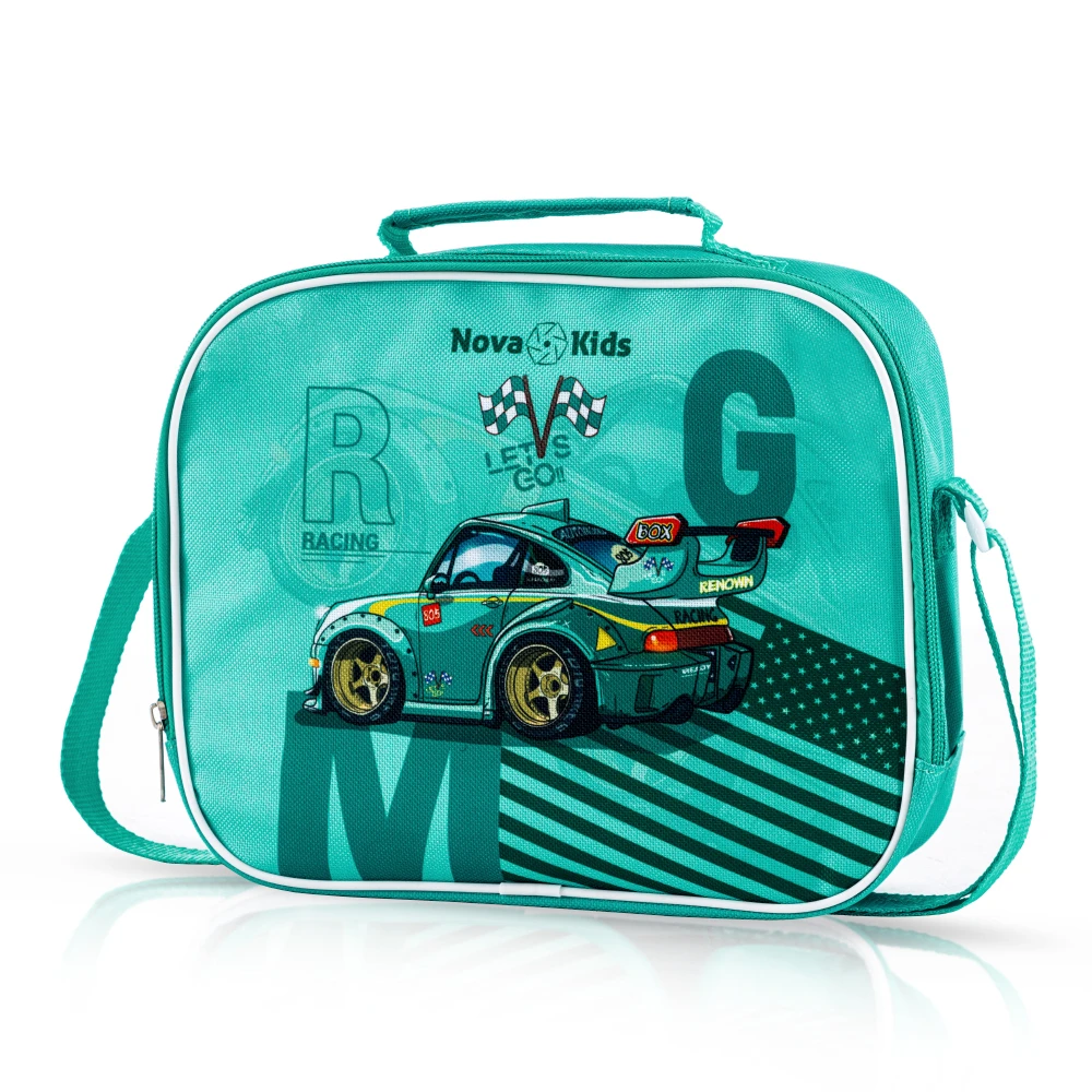 Designed for speed and excitement, the Nova kids trolley school bag set of 5 in car racing green delivers both style and practicality for school adventures. This complete set features a spacious trolley bag with durable wheels and an extendable handle, a matching backpack, an insulated lunch bag, a pencil case, and an accessory pouch. The racing-themed print brings energy and fun to the school day, while the sturdy materials and reinforced stitching ensure lasting durability. The trolley bag provides generous storage with multiple compartments for books, stationery, and personal items, keeping everything organized and accessible. The coordinated accessories make packing for school quick and efficient, offering a seamless blend of function, durability, and eye-catching design.