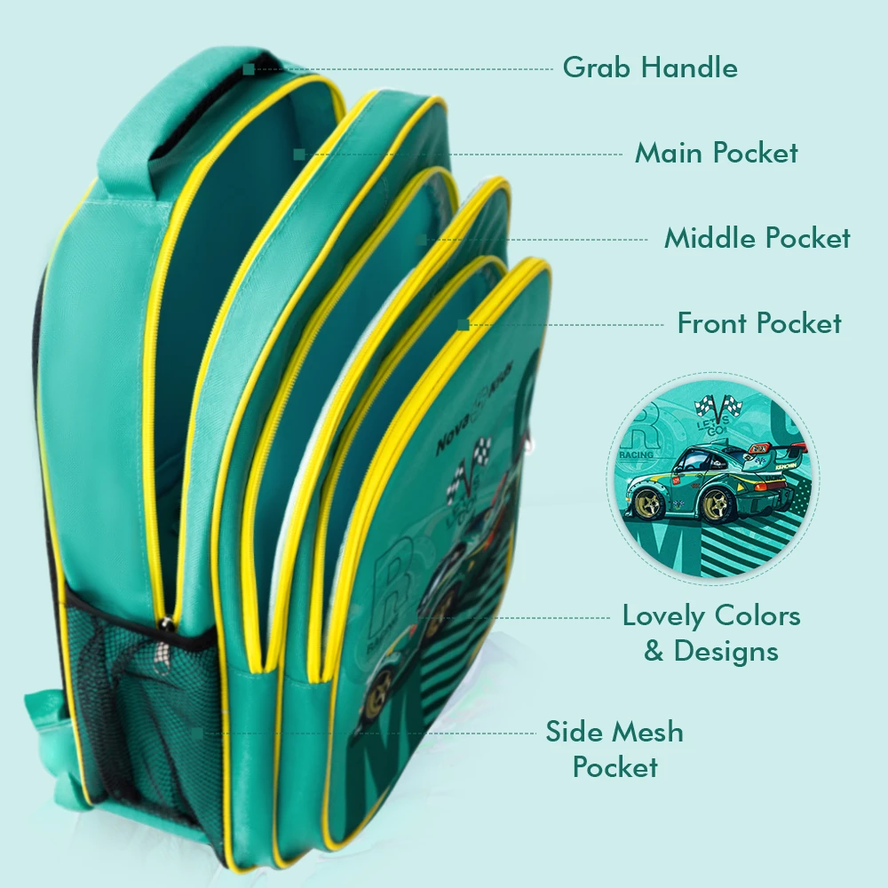 Nova Kids Trolley School Bag Set of 5 - 16 Inch - Car Racing Green