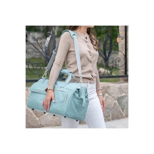 The Sunveno 3in1 Travel Bag in vibrant green perfectly blends exquisite design with practical functionality to create an oversized travel set tailored for busy parents. Made from durable polyester and accented with smooth PU leather trims and upscale gold zipper details, this elegant yet sturdy bag by SAMBOX offers both style and convenience. It includes a detachable premium diaper caddy with multiple compartments and a unique waterproof dry-wet messy bag, providing an all-in-one solution for organizing baby essentials. The wide fish-mouth opening with metal supports allows easy access to contents, while seven internal and five external pockets ensure impeccable organization. Carrying options are versatile with a top handle, adjustable crossbody strap, and a back strap for securing the bag to a suitcase handlebar during travel. Designed for both men and women, this multipurpose bag functions as a diaper bag, travel bag, and handbag, making it an essential companion for family outings and trips.