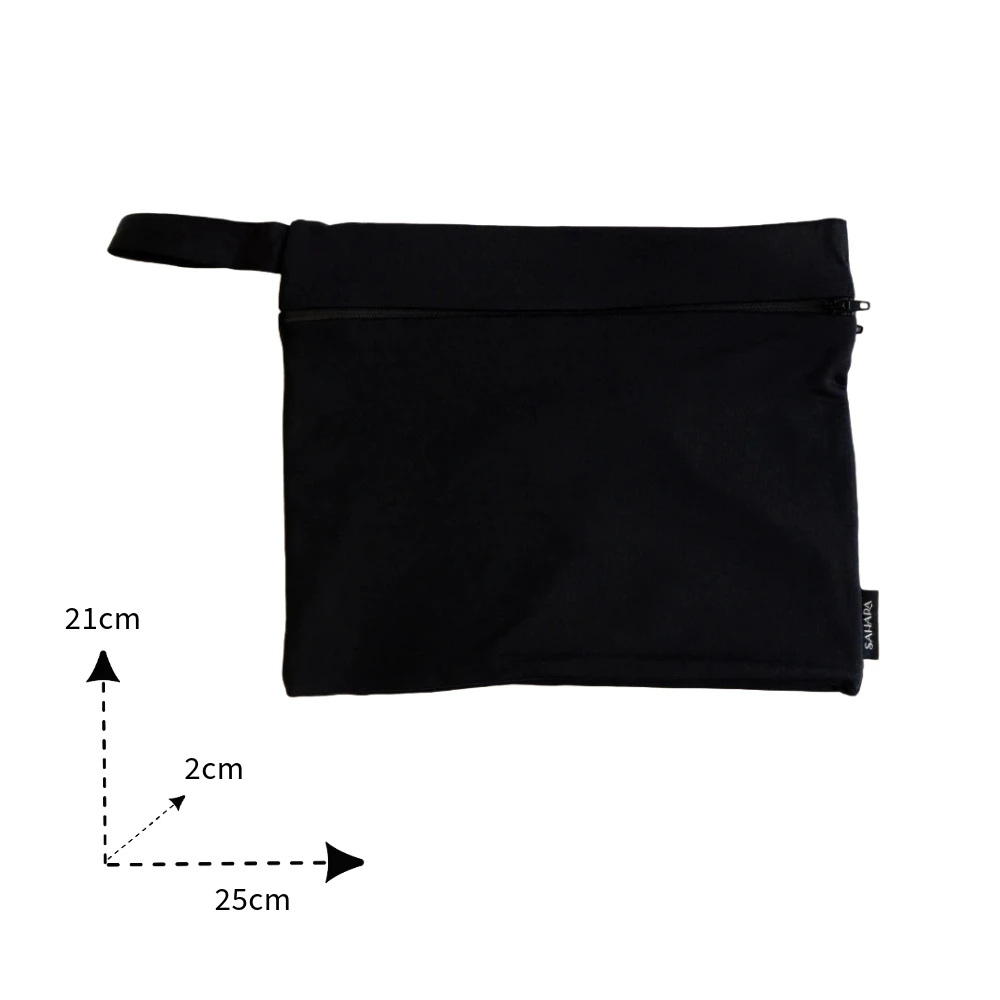 The Sunveno Core Comfort Wet Bag in black is designed to keep your daily essentials fully organized and protected from moisture. Featuring two separate compartments, one side stores clean or dry items while the other side discreetly holds damp or soiled items—eliminating the need for multiple plastic bags. Made from lightweight, durable polyester with a secure top zipper reinforced for stability, the wet bag is easy to carry and fits neatly into a handbag, gym bag, or backpack. A sturdy handle loop ensures convenient portability and effortless hanging. Versatile in use, it’s perfect for storing swimwear, underwear, sunglasses, phone accessories, or even toiletries during travel or errands. Its compact yet resilient design makes it an essential companion for everyday life, combining hygiene with practical organization.