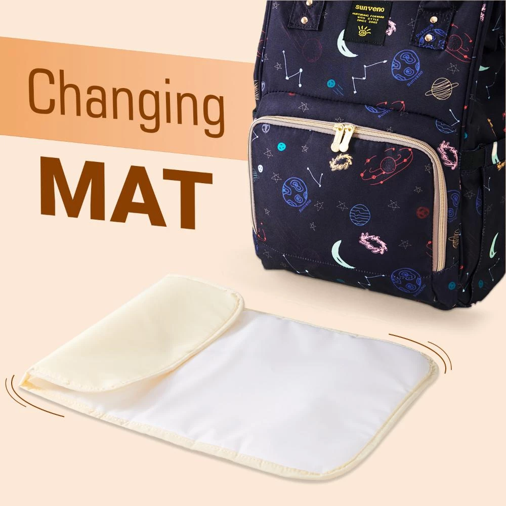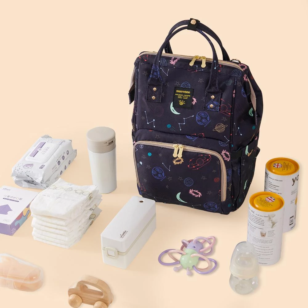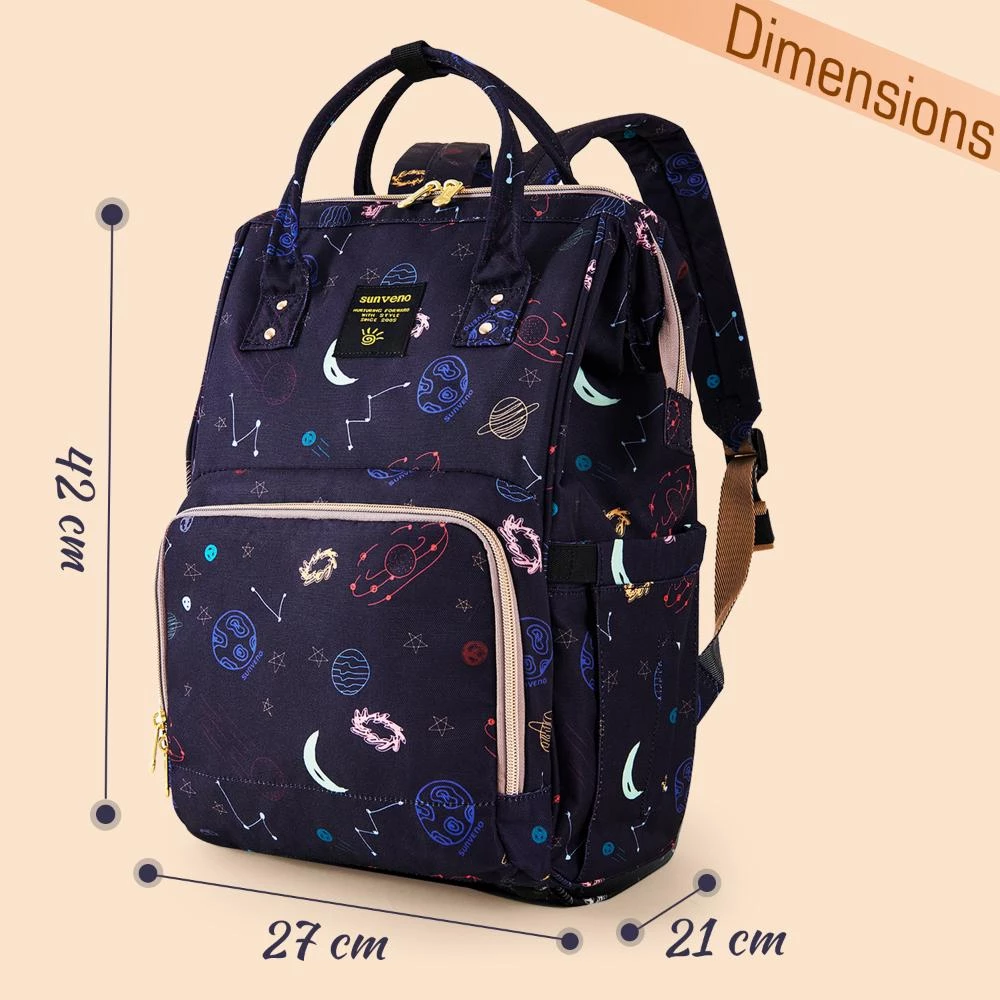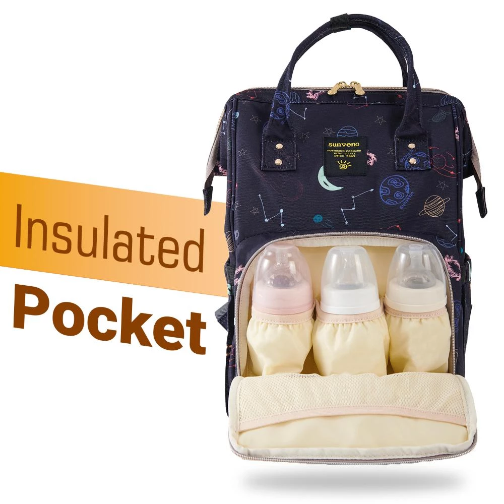 usb diaper bag, galaxy print diaper backpack, Sunveno baby bag, insulated bottle diaper bag, changing mat baby backpack, organized baby bag, modern diaper bag, baby care travel bag, spacious mom backpack, newborn baby gear
