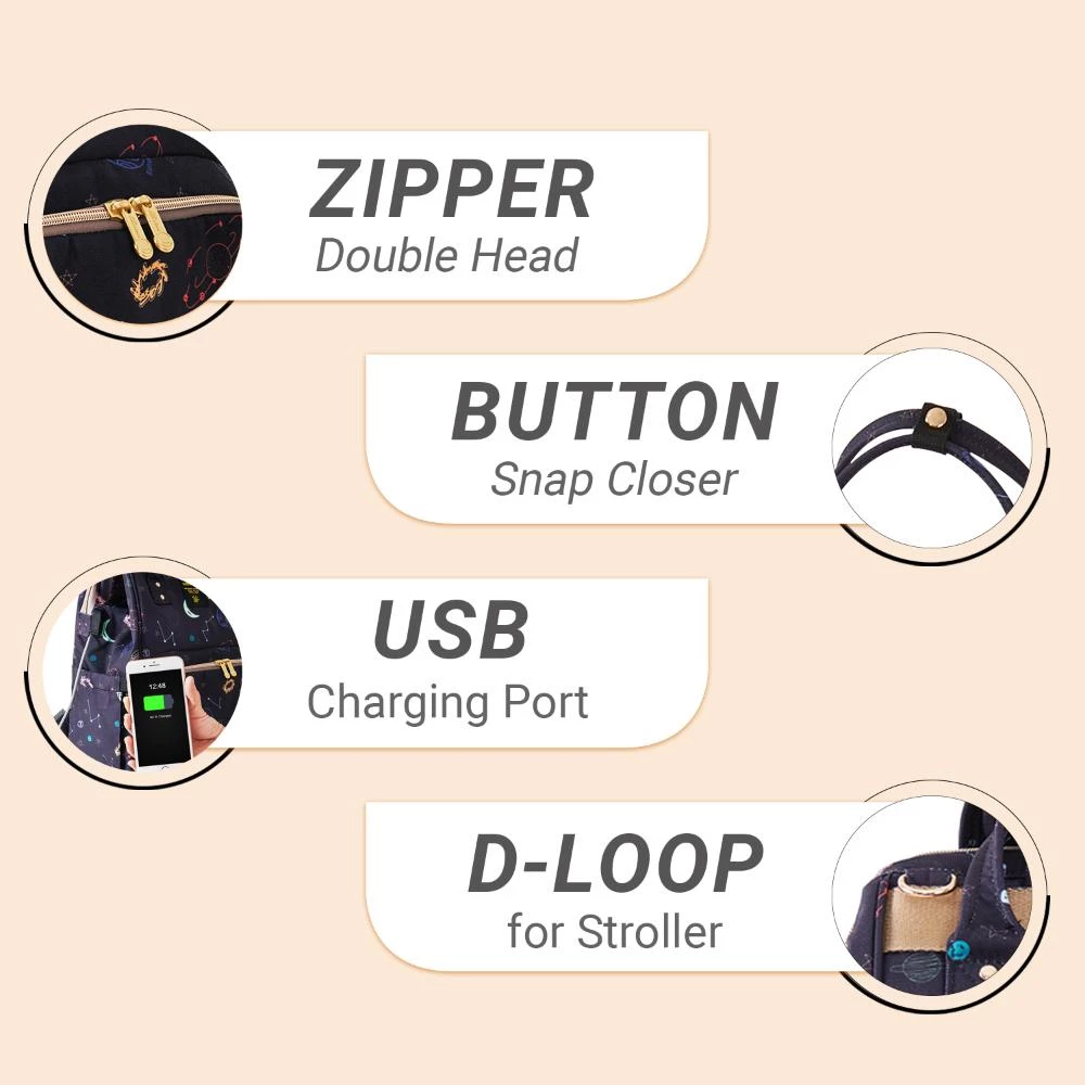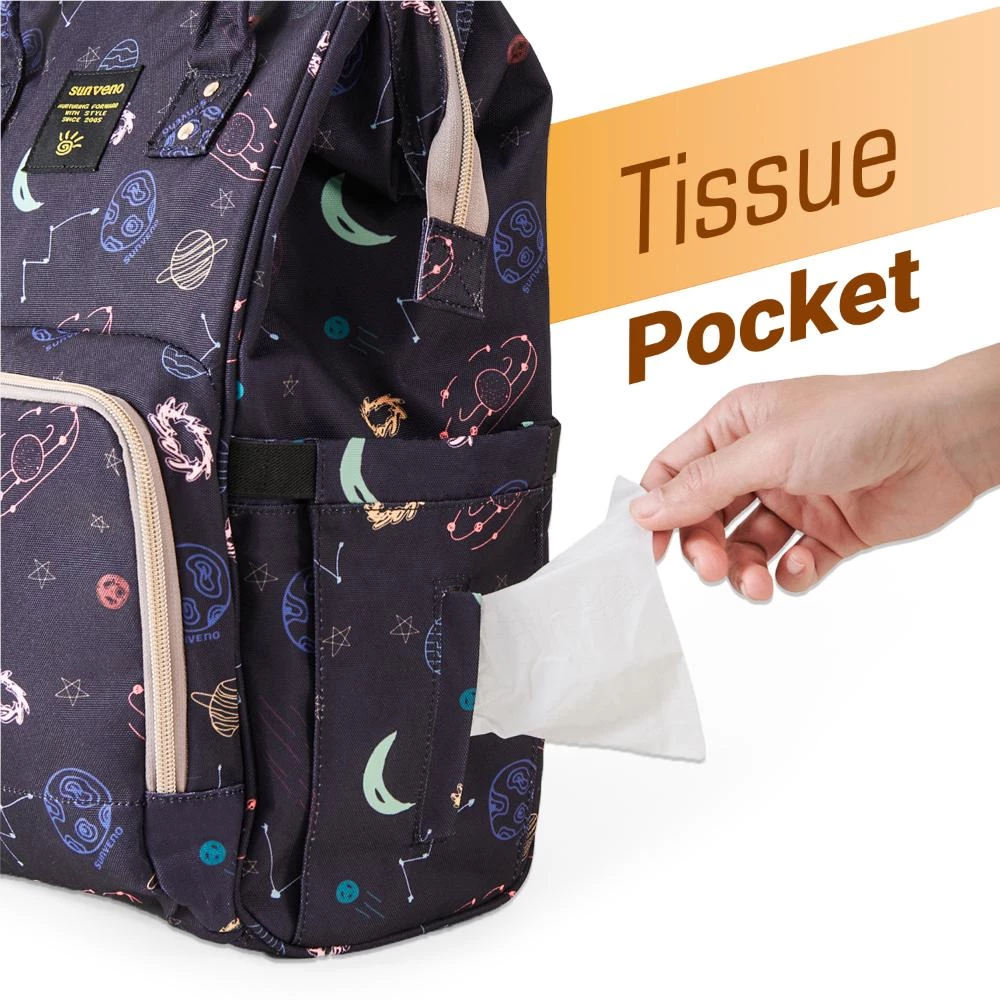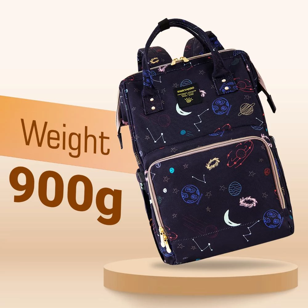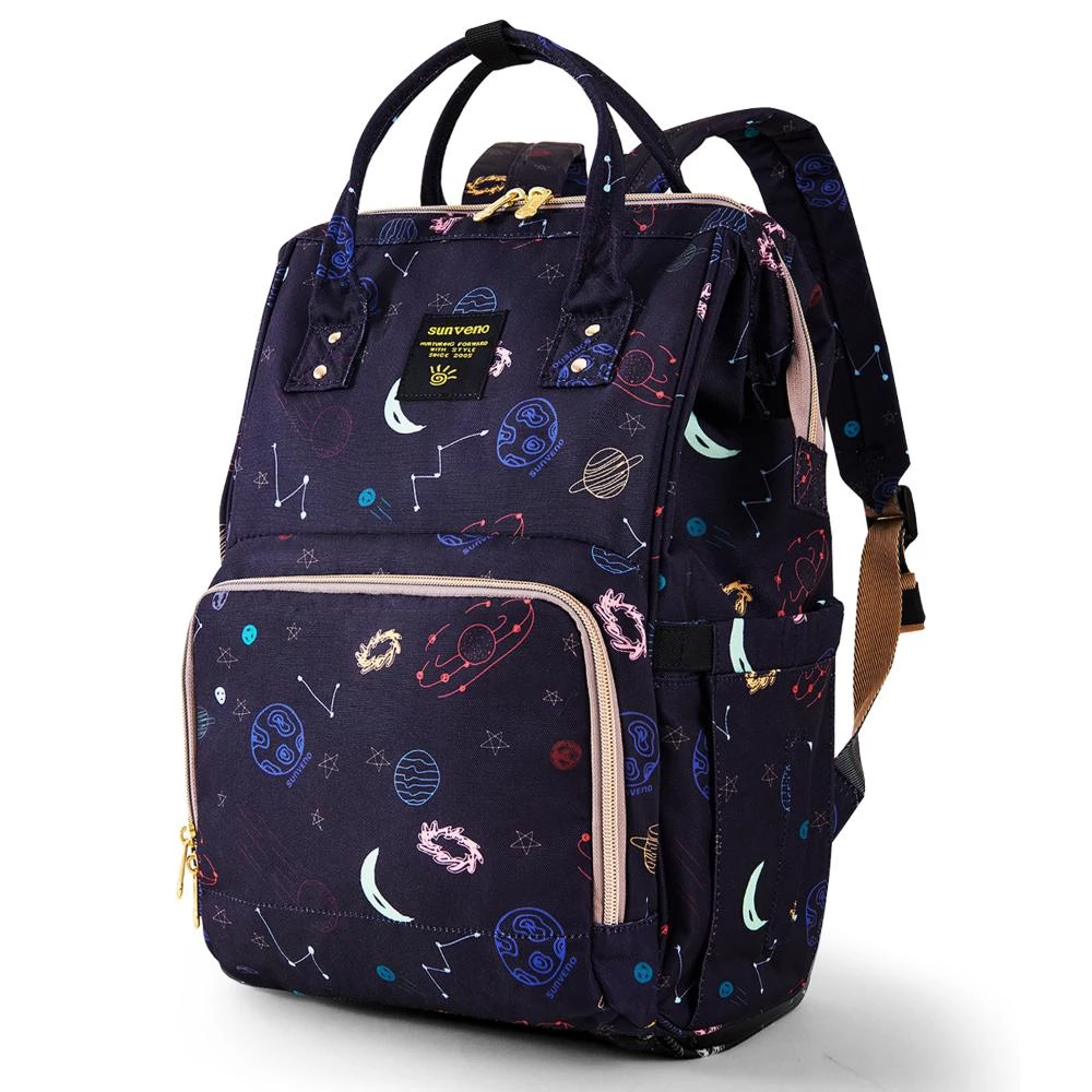 usb diaper bag, galaxy print diaper backpack, Sunveno baby bag, insulated bottle diaper bag, changing mat baby backpack, organized baby bag, modern diaper bag, baby care travel bag, spacious mom backpack, newborn baby gear