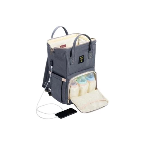 Experience next-level convenience with the Sunveno Diaper Bag with USB Port in elegant grey-perfect for stylish moms who are always on the move. Designed by SAMBOX, this lightweight bag (just 820g) combines fashion and functionality, offering a wide fish-mouth opening with metal support that keeps the top structured and easy to access. A built-in USB port lets you connect your power bank inside the bag and charge your phone outside-without needing to unzip anything. It includes a smart back zipper opening with a waterproof pocket for separating wet and dry items, multiple inner compartments for organizing baby essentials, and three front insulated milk bottle holders to keep drinks warm or cool for up to 4 hours. The side pockets include a tissue dispenser and water bottle space, while a handy key holder string keeps your keys within reach. Designed with padded shoulder straps and rivet-reinforced hand straps, the bag can be carried as a backpack or handbag for all-day comfort. Whether you're caring for one child or twins, this versatile and durable diaper bag will keep you organized and effortlessly stylish.